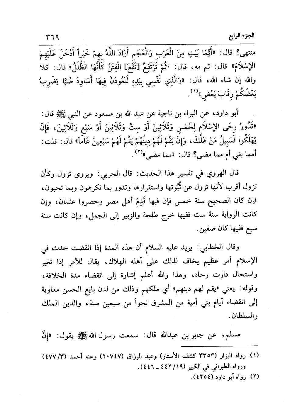 منتهى؟ قال: "أَيُّمَا بَيْتٍ مِنَ الْعَرَبِ وَالْعَجَمِ أَرادَ اللهُ بِهم خَيْرًا أَدخَلَ عَلَيْهمْ الإِسْلاَمَ" قال: ثم مه، قال: "ثُمَّ تَرتَفِعُ [تَقَعَ] الْفِتَنُ كَأَنَّهَا الْظُّلَلُ" قال: كلا والله إن شاء الله، قال: "وَالَّذِي نَفْسِي بِيَدهِ لَتَعُودُنَّ فِيها أَسَاوِدَ صُبًّا يَضْرِبُ بَعْضُكُم رِقَابَ بَعْضٍ" (¬1).