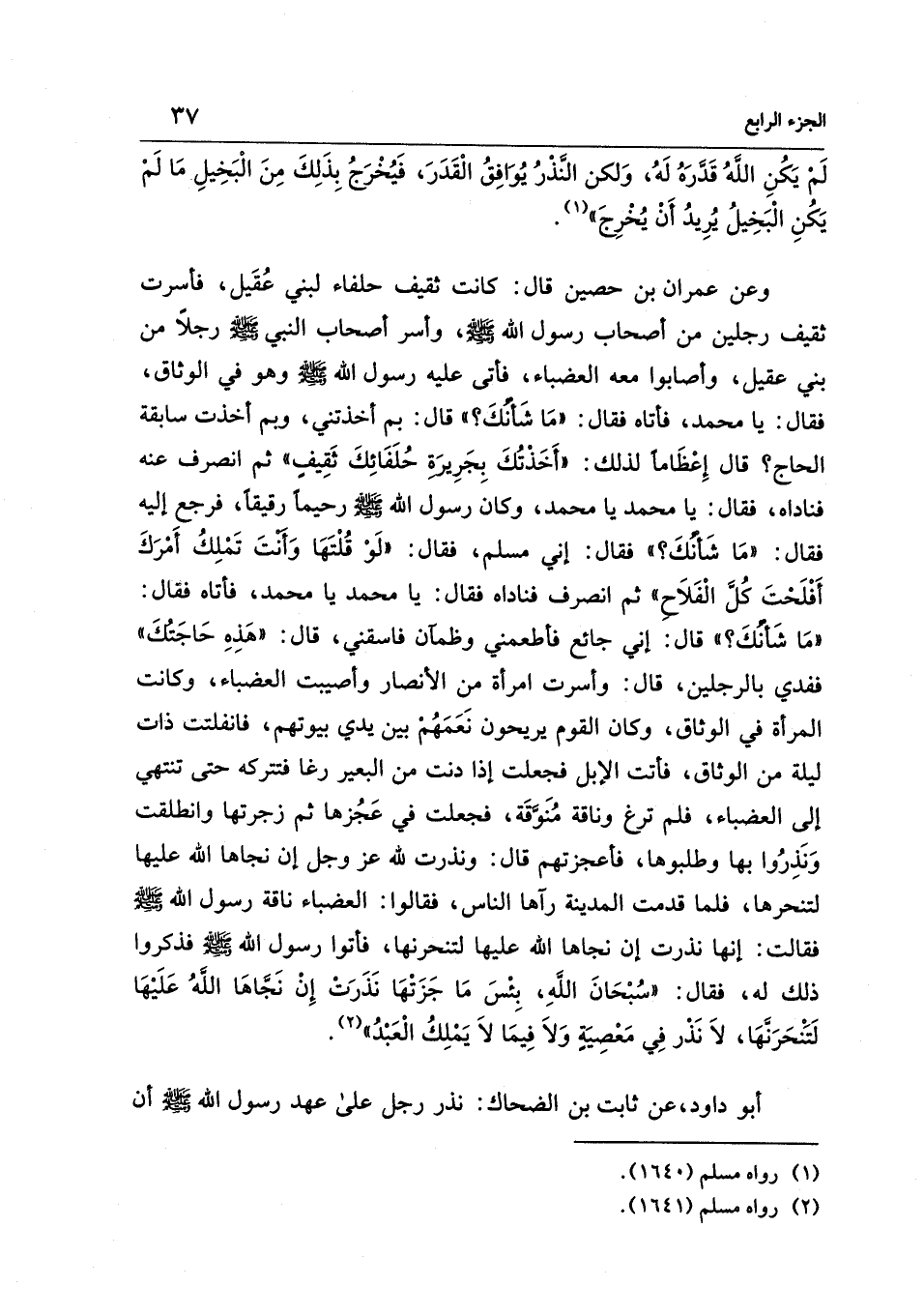 المرأة في الوثاق، وكان القوم يريحون نَعَمَهُمْ بين يدي بيوتهم، فانفلتت ذات ليلة من الوثاق، فاتت الإبل فجعلت إذا دنت من البعير رغا فتتركه حتى تنتهي إلى العضباء، فلم ترغ وناقة مُنَوَّقَة، فجعلت في عَجُزها ثم زجرتها وانطلقت وَنَذِرُوا بها وطلبوها، فأعجزتهم قال: ونذرت لله عز وجل إن نجاها الله عليها لتنحرها، فلما قدمت المدينة رآها الناس، فقالوا: العضباء ناقة رسول الله - صلى الله عليه وسلم - فقالت: إنها نذرت إن نجاها الله عليها لتنحرنها، فأتوا رسول الله - صلى الله عليه وسلم - فذكروا ذلك له، فقال: "سُبْحَانَ اللهِ، بِئْسَ مَا جَزَتْهَا نَذَرَت إِنْ نَجَّاها اللهُ عَلَيْها لَتَنْحَرَنَّها، لاَ نَذْر فِي مَعصِيَةٍ وَلاَ فِيمَا لاَ يَملِكُ الْعَبْدُ" (¬2).