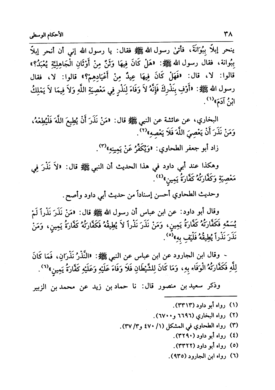 البخاري، عن عائشة عن النبي - صلى الله عليه وسلم - قال: "مَنْ نَذَرَ أَنْ يُطِيعَ اللهَ فَلْيُطِعهُ، وَمَنْ نَذَرَ أَنْ يعصِيَ اللهَ فَلاَ يَعصِهِ" (¬2).