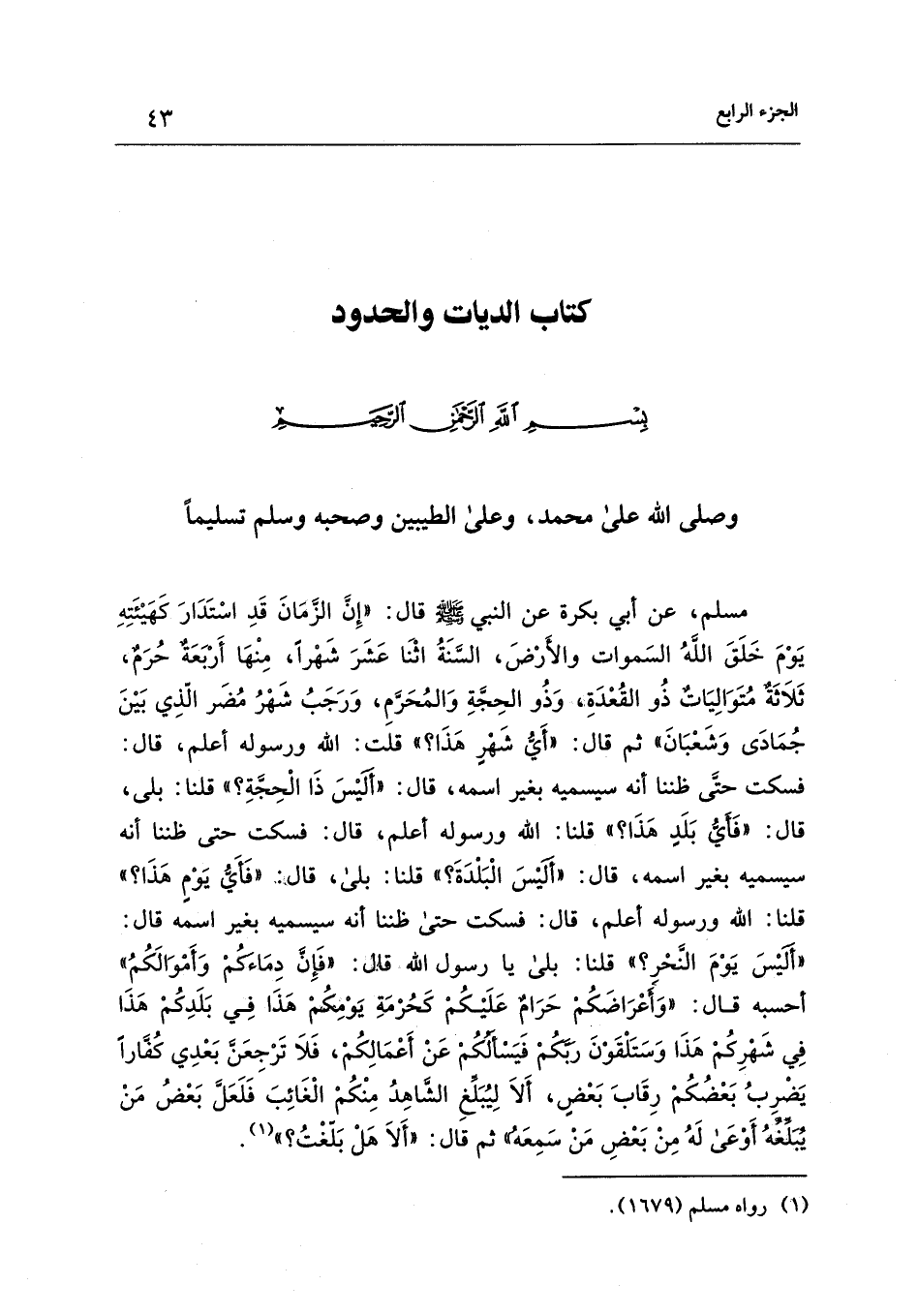 مسلم، عن أبي بكرة عن النبي - صلى الله عليه وسلم - قال: "إِنَّ الزَّمَانَ قَدِ اسْتَدَارَ كَهَيْئَتِهِ يَوْمَ خَلَقَ اللهُ السَّمَوَاتِ وَالأَرْضَ، السَّنَةُ اثْنَا عَشَرَ شَهْرًا، مِنْهَا أَرْبَعَةٌ حُرُمٌ، ثَلاَثةٌ مُتَوَالِيَاتٌ ذُو القَعْدَةِ، وَذُو الحِجَّةِ وَالمُحَرَّمُ، وَرَجَبُ شَهْرُ مُضَرَ الَّذِي بَيْنَ جُمَادَى، وَشَعْبَانَ" ثم قال: "أَيُّ شَهْرٍ هَذَا؟ " قلت: الله ورسوله أعلم، قال: فسكت حتَّى ظننا أنه سيسميه بغير اسمه، قال: "ألَيْسَ ذَا الْحِجَّةِ؟ " قلنا: بلى، قال: "فَأَيُّ بَلَدٍ هَذَا؟ " قلنا: الله ورسوله أعلم، قال: فسكت حتى ظننا أنه سيسميه بغير اسمه، قال: "أَلَيْسَ الْبَلْدَةَ؟ " قلنا: بلى، قال: "فَأَيُّ يَوْمٍ هَذَا؟ " قلنا: الله ورسوله أعلم، قال: فسكت حتى ظننا أنه سيسميه بغير إسمه قال: "أَلَيْسَ يَوْمَ النَّحْر؟ " قلنا: بلى يا رسول الله قإل: "فَإِنَّ دِمَاءَكُمْ وَأَمْوَالَكُمُ" أحسبه قال: "وَأَعْرَاضَكُمْ حَرَامٌ عَلَيْكُمْ كَحُرْمَةِ يَوْمِكُمْ هَذَا فِي بَلَدِكُمْ هَذَا فِي شَهْرِكُمْ هَذَا وَسَتَلْقَوْنَ رَبَّكُمْ فَيَسْأَلُكُمْ عَنْ أَعْمَالِكُمْ، فَلاَ تَرْجِعَنَّ بَعْدِي كُفَّارًا يَضْرِبُ بَعْضُكُمْ رِقَابَ بَعْضِ، أَلاَ لِيُبَلِّغِ الشَّاهِدُ مِنْكُمْ الْغَائِبَ فَلَعَلَّ بَعْضُ مَنْ يُبَلِّغُهُ أَوْعَى لَهُ مِنْ بَعْضِ مَنْ سَمِعَهُ" ثم قال: "أَلاَ هَلْ بَلّغْتُ؟ " (¬1).