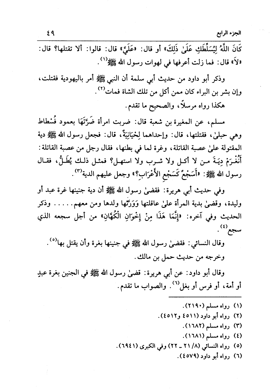 وفي حديث أبي هريرة: فقضى رسول الله - صلى الله عليه وسلم - أن دية جنينها غرة عبد أو وليدة، وقضى بدية المرأة على عاقلتها وَوَرثَّها ولدها ومن معهم. . . . . وذكر الحديث وفي آخره: "إِنَّمَا هَذَا مِنْ إِخْوَانِ الْكُهَّانِ" من أجل سجعه الذي سجع (¬4).