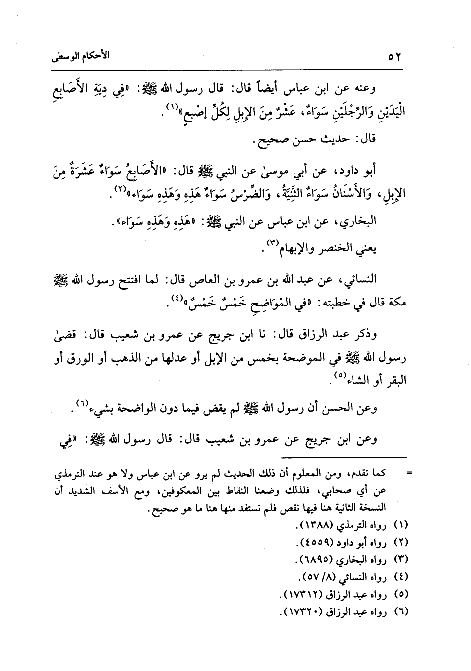 وعنه عن ابن عباس أيضًا قال: قال رسول الله - صلى الله عليه وسلم -: "فِي دِيَةِ الأَصَابِعِ الْيَدَيْنِ وَالرِّجْلَيْنِ سَوَاءٌ، عَشْرٌ مِنَ الإِبِلِ لِكُلِّ إصْبعٍ" (¬1).