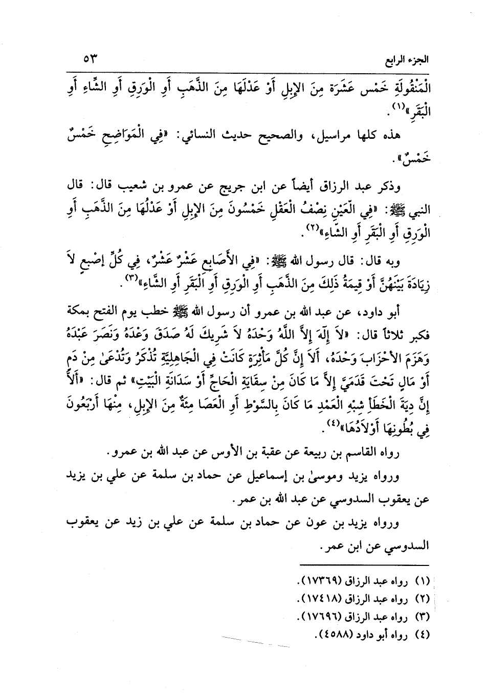 أبو داود، عن عبد الله بن عمرو أن رسول الله - صلى الله عليه وسلم - خطب يوم الفتح بمكة فكبر ثلاثًا قال: "لَا إِلَهَ إِلَّا اللهُ وَحْدَهُ لَا شَرِيكَ لَهُ صَدَقَ وَعْدَهُ وَنَصَرَ عَبْدَهُ وَهَزَمَ الأحْزَابَ وَحْدَهُ، أَلَا إِنَّ كُلَّ مَأْثِرَةٍ كَانَتْ فِي الْجَاهِلِيَّةِ تُذْكَرُ وَتُدْعَى مِنْ دَمٍ أَوْ مَالٍ تَحْتَ قَدَمَيَّ إِلَّا مَا كَانَ مِنْ سِقَايَةِ الْحَاجِّ أَوْ سَدَانَةِ الْبَيْتِ" ثم قال: "أَلَا إِنَّ دِيَةَ الْخَطَأِ شِبْهِ الْعَمْدِ مَا كَانَ بِالسَّوْطِ أَوِ الْعَصَا مِئَةٌ مِنَ الإِبِلِ، مِنْهَا أَرْبَعُونَ فِي بُطُونِهَا أَوْلَادُهَا" (¬4).