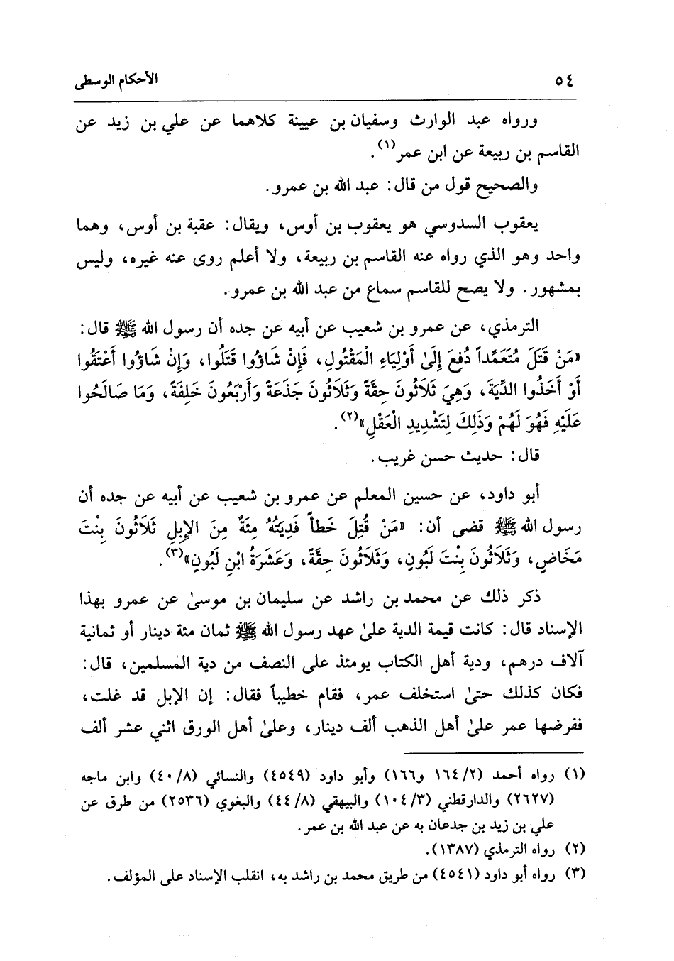 الترمذي، عن عمرو بن شعيب عن أبيه عن جده أن رسول الله - صلى الله عليه وسلم - قال: "مَنْ قَتلَ مُتَعَمِّدًا دُفِعَ إِلَى أَوْلِيَاءِ الْمَقْتُولِ، فَإِنْ شَاؤُوا قَتَلُوا، وَإِنْ شَاؤُوا أَعْتَقُوا أَوْ أَخَذُوا الدِّيَةَ، وَهِيَ ثَلَاثُونَ حِقَّةً وَثَلَاثُونَ جَذَعَةً وَأَرْبَعُونَ خَلِفَةً، وَمَا صَالَحُوا عَلَيْهِ فَهُوَ لَهُمْ وَذَلِكَ لِتشدِيدِ الْعَقْلِ" (¬2).