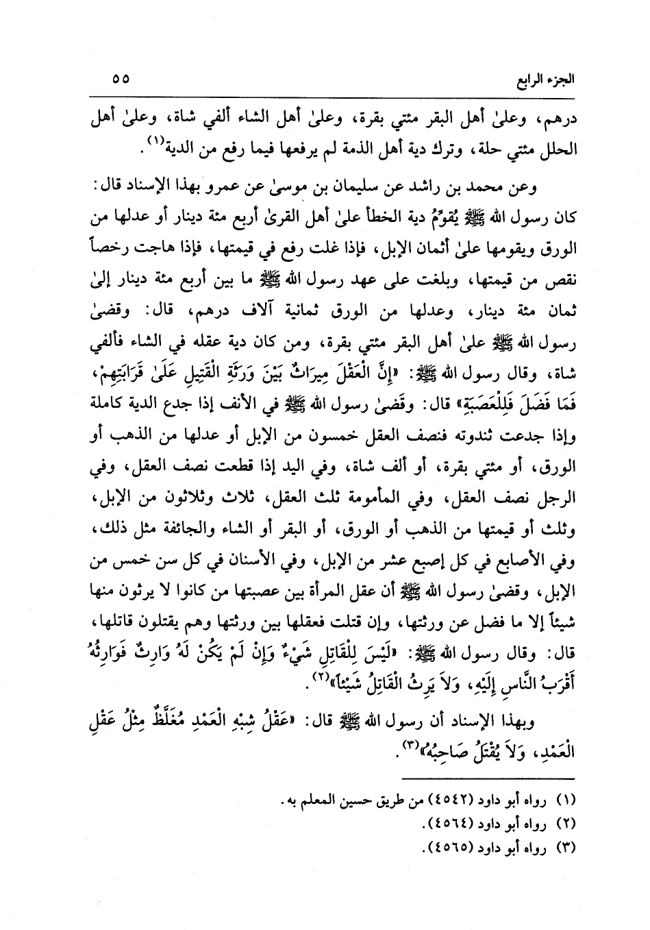 وعن محمد بن راشد عن سليمان بن موسى عن عمرو بهذا الإسناد قال: كان رسول الله - صلى الله عليه وسلم - يُقوِّمُ دية الخطأ على أهل القرى أربع مئة دينار أو عدلها من الورق ويقومها على أثمان الإبل، فإذا غلت رفع في قيمتها، فإذا هاجت رخصًا نقص من قيمتها، وبلغت على عهد رسول الله - صلى الله عليه وسلم - ما بين أربع مئة دينار إلى ثمان مئة دينار، وعدلها من الورق ثمانية آلاف درهم، قال: وقضى رسول الله - صلى الله عليه وسلم - على أهل البقر مئتي بقرة، ومن كان دية عقله في الشاء فألفي شاة، وقال رسول الله - صلى الله عليه وسلم -: "إِنَّ الْعَقْلَ مِيرَاثٌ بَيْنَ وَرثَةِ الْقَتِيلِ عَلَى قَرَابَتِهِمْ، فَمَا فَضَلَ فَلِلْعَصَبَةِ" قال: وقَضى رسول الله - صلى الله عليه وسلم - في الأنف إذا جاع الدية كاملة وإذا جدعت ثندوته فنصف العقل خمسون من الإبل أو عدلها من الذهب أو الورق، أو مئتي بقرة، أو ألف شاة، وفي اليد إذا قطعت نصف العقل، وفي الرجل نصف العقل، وفي المأمومة ثلث العقل، ثلاث وثلاثون من الإبل، وثلث أو قيمتها من الذهب أو الورق، أو البقر أو الشاء والجائفة مثل ذلك، وفي الأصابع في كل إصبع عشر من الإبل، وفي الأسنان في كل سن خمس من الإبل، وقضى رسول الله - صلى الله عليه وسلم - أن عقل المرأة بين عصبتها من كانوا لا يرثون منها شيئًا إلا ما فضل عن ورثتها، وإن قتلت فعقلها بين ورثتها وهم يقتلون قاتلها، قال: وقال رسول الله - صلى الله عليه وسلم -: "لَيْسَ لِلْقَاتِلِ شَيْءٌ وَإِنْ لَمْ يَكُنْ لَهُ وَارِثٌ فَوَارِثُهُ أَقْرَبُ الناسِ إِلَيْهِ، وَلَا يَرِثُ الْقَاتِلُ شَيْئًا" (¬2).
