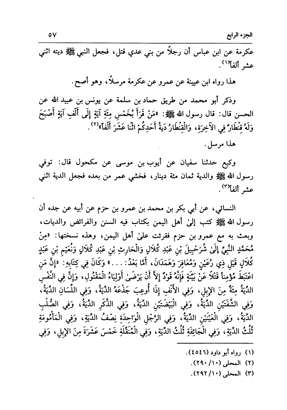النسائي، عن أبي بكر بن محمد بن عمرو بن حزم عن أبيه عن جده أن رسول الله - صلى الله عليه وسلم - كتب إلى أهل اليمن بكتاب فيه السنن والفرائض والديات، وبعث به مع عمرو بن حزم فقرئت على أهل اليمن، وهذه نسختها: "مِنْ مُحَمَّدٍ النَّبِيِّ إلَي شُرَحْبِيلَ بْنِ عَبْدِ كُلَالٍ وَالْحَارِثِ بْنِ عَبْدِ كُلَالٍ وَنُعَيْمِ بْنِ عَبْدٍ كُلَالٍ قَيْلِ ذِي رُعَيْنِ وَمُعَافِرَ وَهَمَدَانَ، أَمَّا بَعْدُ:. . ." وَكَانَ فِي كِتَابهِ: "إِنَّ مَنِ اعْتَبَطَ مُؤْمِنًا قَتْلًا عَنْ بَيِّنَةٍ فَإِنَّهُ قَوْدٌ إِلَّا أَنْ يَرْضَى أَوْلِيَاءُ الْمَقْتُولِ، وَإِنَّ فِي النَّفْسِ الدِّيَةُ مِئَةٌ مِنَ الإِبِلِ، وَفِي الأَنْفِ إِذَا أُوعِبَ جَذْعَهُ الدِّيَةُ، وَفِي اللِّسَانِ الدِّيَةُ، وَفِي الشَّفَتَيْنِ الدِّيَةُ، وَفِي الْبَيْضَتَيْنِ الدِّيَةُ، وَفِي الذَّكَرِ الدِّيَةُ، وَفِي الصُّلْبِ الدِّيَةُ، وَفِي الْعَيْنَيْنِ الدِّيَةُ، وَفِي الرِّجْلِ الْوَاحِدَةِ نِصْفُ الدِّيَةِ، وَفِي الْمَأْمُومَةِ ثُلُثُ الدِّيَةِ، وَفِي الْجَائِفَةِ ثُلُثُ الدِّيَةِ، وَفِي المُنَقِّلَةِ خَمْسَ عَشَرَةَ مِنَ الإِبِلِ، وَفِي