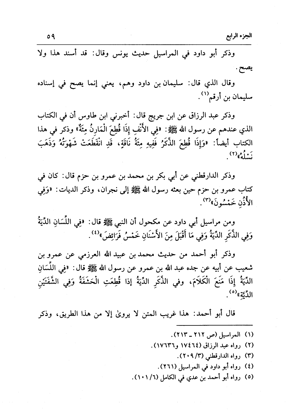 وذكر عبد الرزاق عن ابن جريج قال: أخبرني ابن طاوس أن في الكتاب الذي عندهم عن رسول الله - صلى الله عليه وسلم -: "فِي الأَنْفِ إِذَا قُطِعَ الْمَارِنُ مِئَةٌ" وذكر في هذا الكتاب أيضًا: "وَإِذَا قُطِعَ الذَّكَرُ فَفِيهِ مِئَةُ نَاقَةٍ، قَدِ انْقَطَعَتْ شَهْوَتُهُ وَذَهَبَ نَسْلُهُ" (¬2).