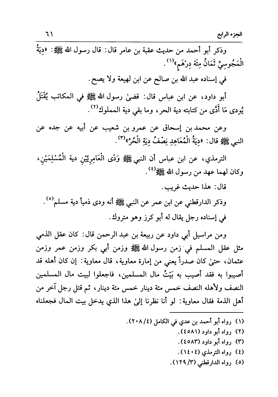ومن مراسيل أبي داود عن ربيعة بن عبد الرحمن قال: كان عقل الذمي مثل عقل المسلم في زمن رسول الله - صلى الله عليه وسلم - وزمن أبي بكر وزمن عمر وزمن عثمان، حتى كان صدرًا يعني من إمارة معاوية، قال معاوية: إن كان أهله قد أصيبوا به فقد أصيب به بَيْتُ مال المسلمين، فاجعلوا لبيت مال المسلمين النصف ولأهله النصف خمس مئة دينار خمس مئة دينار، ثم قتل رجل آخر من أهل الذمة فقال معاوية: لو أنا نظرنا إلى هذا الذي يدخل بيت المال فجعلناه