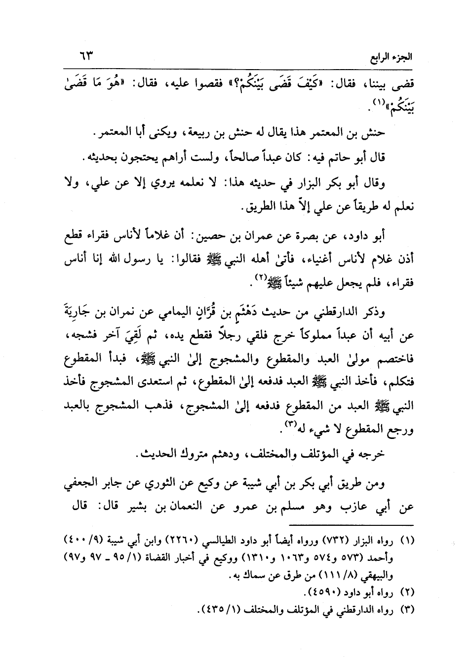 وذكر الدارقطني من حديث دَهْثَمٍ بن قُرَّانِ اليمامي عن نمران بن جَارِيَةَ عن أبيه أن عبدًا مملوكًا خرج فلقي رجلًا فقطع يده، ثم لَقِيَ آخر فشجه، فاختصم مولى العبد والمقطوع والمشجوج إلى النبي - صلى الله عليه وسلم -، فبدأ المقطوع فتكلم، فأخذ النبي - صلى الله عليه وسلم - العبد فدفعه إلي المقطوع، ثم استعدى المشجوج فأخذ النبي - صلى الله عليه وسلم - العبد من المقطوع فدفعه إلى المشجوج، فذهب المشجوج بالعبد ورجع المقطوع لا شيء له (¬3).