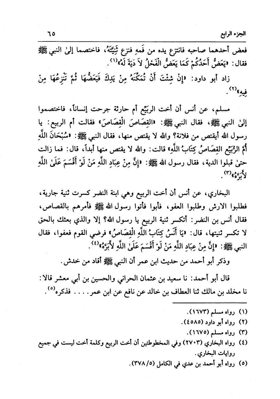 البخاري، عن أنس أن أخت الربيع وهي ابنة النضر كسرت ثنية جارية، فطلبوا الارش وطلبوا العفو، فأبوا فأتوا رسول الله - صلى الله عليه وسلم - فأمرهم بالقصاص، فقال أنس بن النضر: أتكسر ثنية الربيع يا رسول الله؟ إلا والذي بعثك بالحق لا تكسر ثنيتها، قال: "يَا أَنَسُ كِتَابُ اللهِ الْقِصَاصُ" فرضي القوم فعفوا، فقال النبي - صلى الله عليه وسلم -: "إِنَّ مِنْ عِبَادِ اللهِ مَنْ لَوْ أَقْسَمَ عَلَى اللهِ لأَبَرَّهُ" (¬4).
