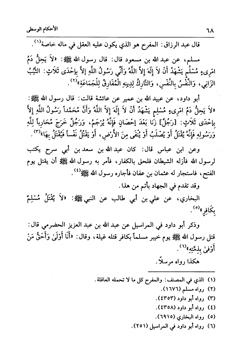 أبو داود، عن عبيد الله بن عمير عن عائشة قالت: قال رسول الله - صلى الله عليه وسلم -: "لَا يَحِلُّ دَمُ امْرِئٍ مُسْلِمٍ يَشْهَدُ أنْ لَا إِلهَ إِلَّا اللهُ وَأَنَّ مُحَمَّدًا رَسُولُ اللهِ إِلَّا بِإحْدَى ثَلَاثٍ: [رَجُلٌ] زَنا بَعْدَ إحْصَانٍ فَإِنَّهُ يُرْجَمُ، وَرَجُلٌ خَرَجَ مُحَارِبًا للهِ وَرَسُولهِ فَإِنَّهُ يُقْتَلُ أَوْ يُصْلَبُ أَوْ يُنْفَى مِنَ الأرْضِ، أَوْ يَقْتلُ نَفْسًا فَيُقْتَلُ بِهَا" (¬3).