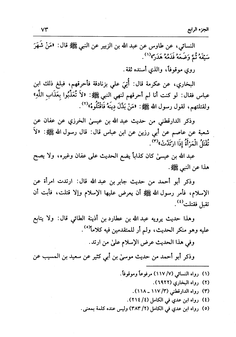 البخاري، عن عكرمة قال: أُتِيَ علي بزنادقة فأحرقهم، فبلغ ذلك ابن عباس فقال: لو كنت أنا لم أحرقهم لنهي النبي - صلى الله عليه وسلم -: "لَا تُعَذِّبُوا بِعَذَابِ اللهِ" ولقتلتهم، لقول رسول الله - صلى الله عليه وسلم -: "مَنْ بَدَّلَ دِينَهُ فَاقْتُلُوهُ" (¬2).