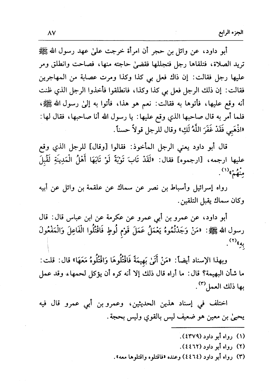 قال أبو داود يعني الرجل المأخوذ: فقالوا [وقال] للرجل الذي وقع عليها ارجمه، [ارجموه] فقال: "لَقَدْ تَابَ تَوْبَةً لَوْ تَابَهَا أَهْلُ الْمَدِينَةِ لَقُبِلَ