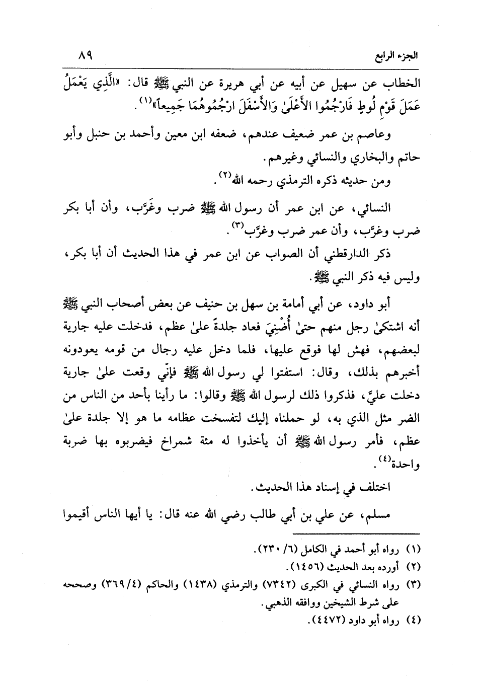 أبو داود، عن أبي أمامة بن سهل بن حنيف عن بعض أصحاب النبي - صلى الله عليه وسلم - أنه اشتكى رجل منهم حتى أُضْنِيَ فعاد جلدةً على عظم، فدخلت عليه جارية لبعضهم، فهش لها فوقع عليها، فلما دخل عليه رجال من قومه يعودونه أخبرهم بذلك، وقال: استفتوا لي رسول الله - صلى الله عليه وسلم - فإنّي وقعت على جارية دخلت عليَّ، فذكروا ذلك لرسول الله - صلى الله عليه وسلم - وقالوا: ما رأينا بأحد من الناس من الضر مثل الذي به، لو حملناه إليك لتفسخت عظامه ما هو إلا جلدة على عظم، فأمر رسول الله - صلى الله عليه وسلم - أن يأخذوا له مئة شمراخ فيضربوه بها ضربة واحدة (¬4).