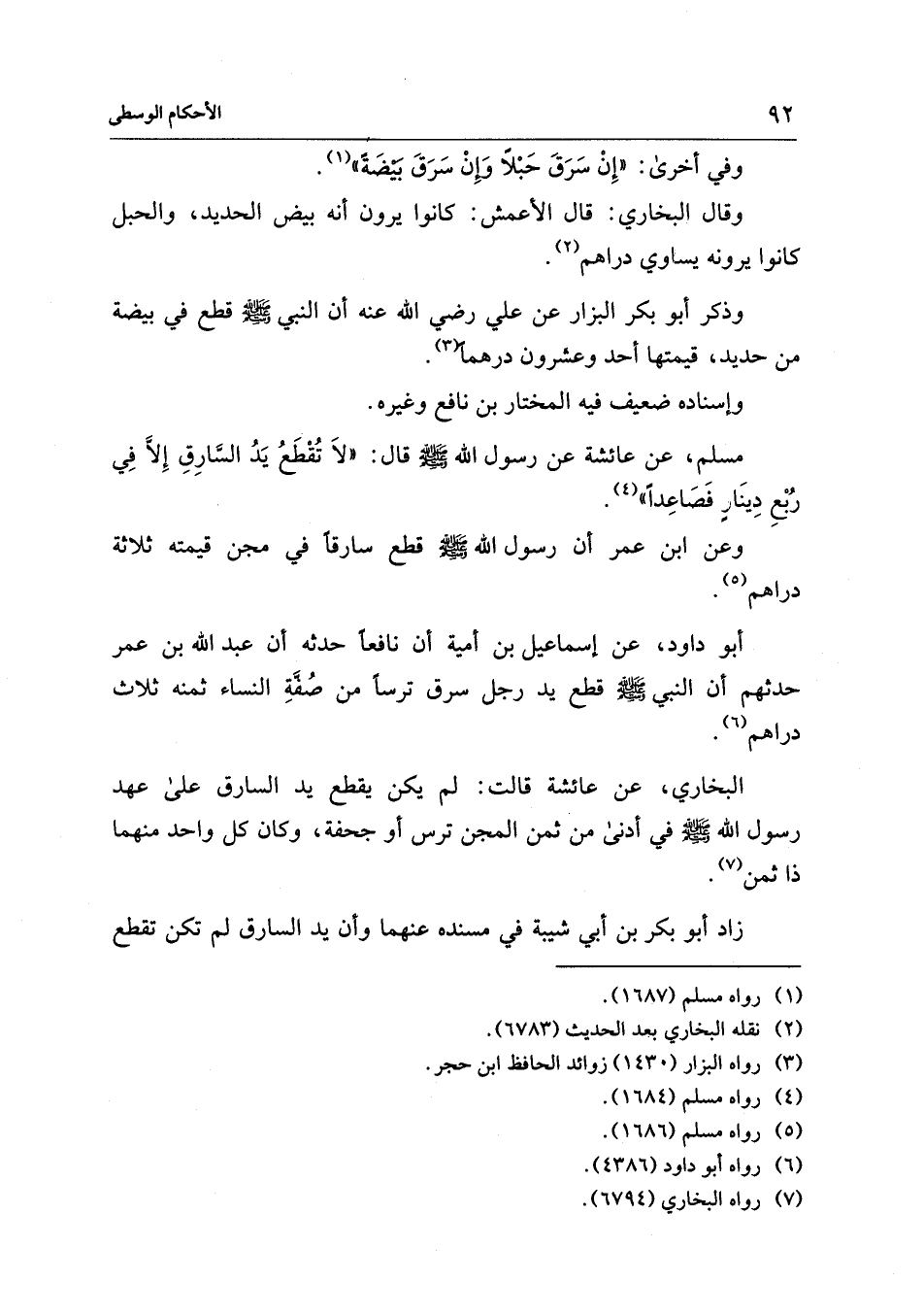 مسلم، عن عائشة عن رسول الله - صلى الله عليه وسلم - قال: "لاَ تُقْطَعُ يَدُ السَّارِقِ إِلَّا فِي رُبْعِ دِينَارٍ فَصَاعِدًا" (¬4).