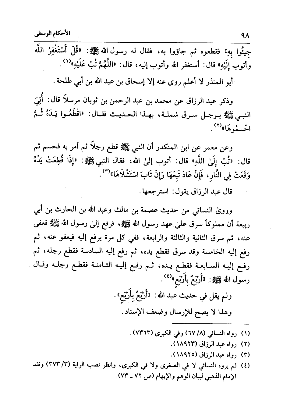 وروى النسائي من حديث عصمة بن مالك وعبد الله بن الحارث بن أبي ربيعة أن مملوكًا سرق على عهد رسول الله - صلى الله عليه وسلم -، فرفع إلى رسول الله - صلى الله عليه وسلم - فعفى عنه، ثم سرق الثانية والثالثة والرابعة، ففي كل مرة يرفع إليه فيعفو عنه، ثم رفع إليه الخامسة وقد سرق فقطع يده، ثم رفع إليه السادسة فقطع رجله، ثم رفع إليه السابعة فقطع يده، ثم رفع إليه الثامنة فقطع رجله وقال رسول الله - صلى الله عليه وسلم -: "أَرْبَعٌ بِأَربْعٍ" (¬4).