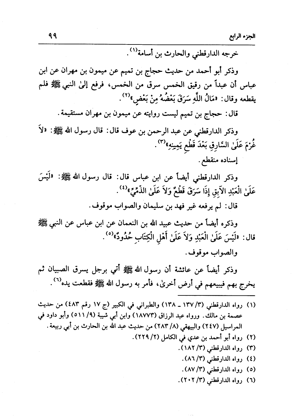 وذكر الدارقطني أيضًا عن ابن عباس قال: قال رسول الله - صلى الله عليه وسلم -: "لَيْسَ عَلَى الْعَبْدِ الآبِقِ إِذَا سَرَقَ قَطْعٌ وَلاَ عَلَى الذّمِّيِّ" (¬4).