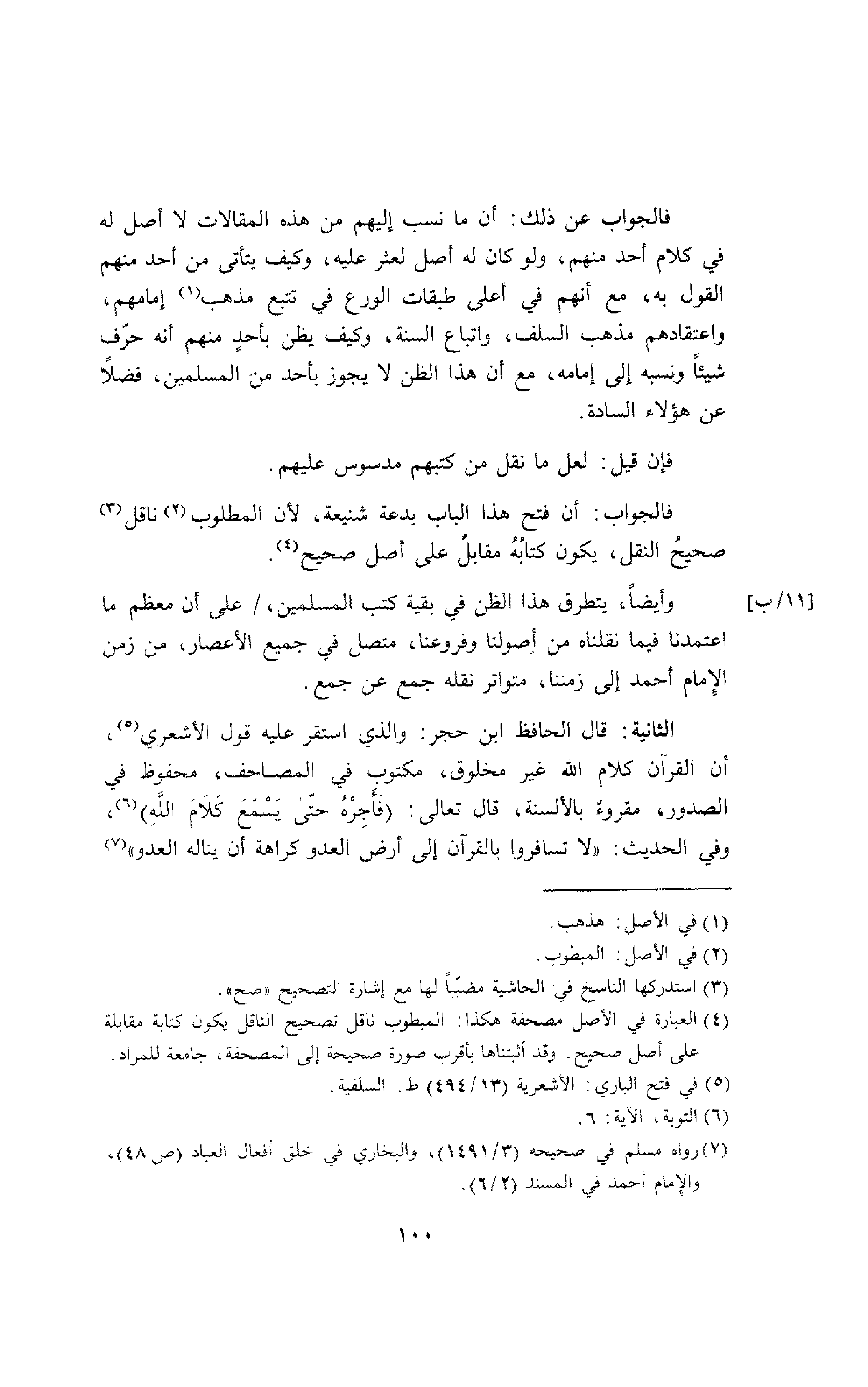 "11/ب" وأيضًا، يتطرق هذا الظن في بقية كتب المسلمين، على أن معظم ما اعتمدنا فيما نقلناه من أصولنا وفروعنا متصل في جميع الأعصار، من زمن الإمام أحمد إلى زمننا، متواتر نقله جمع عن جمع.