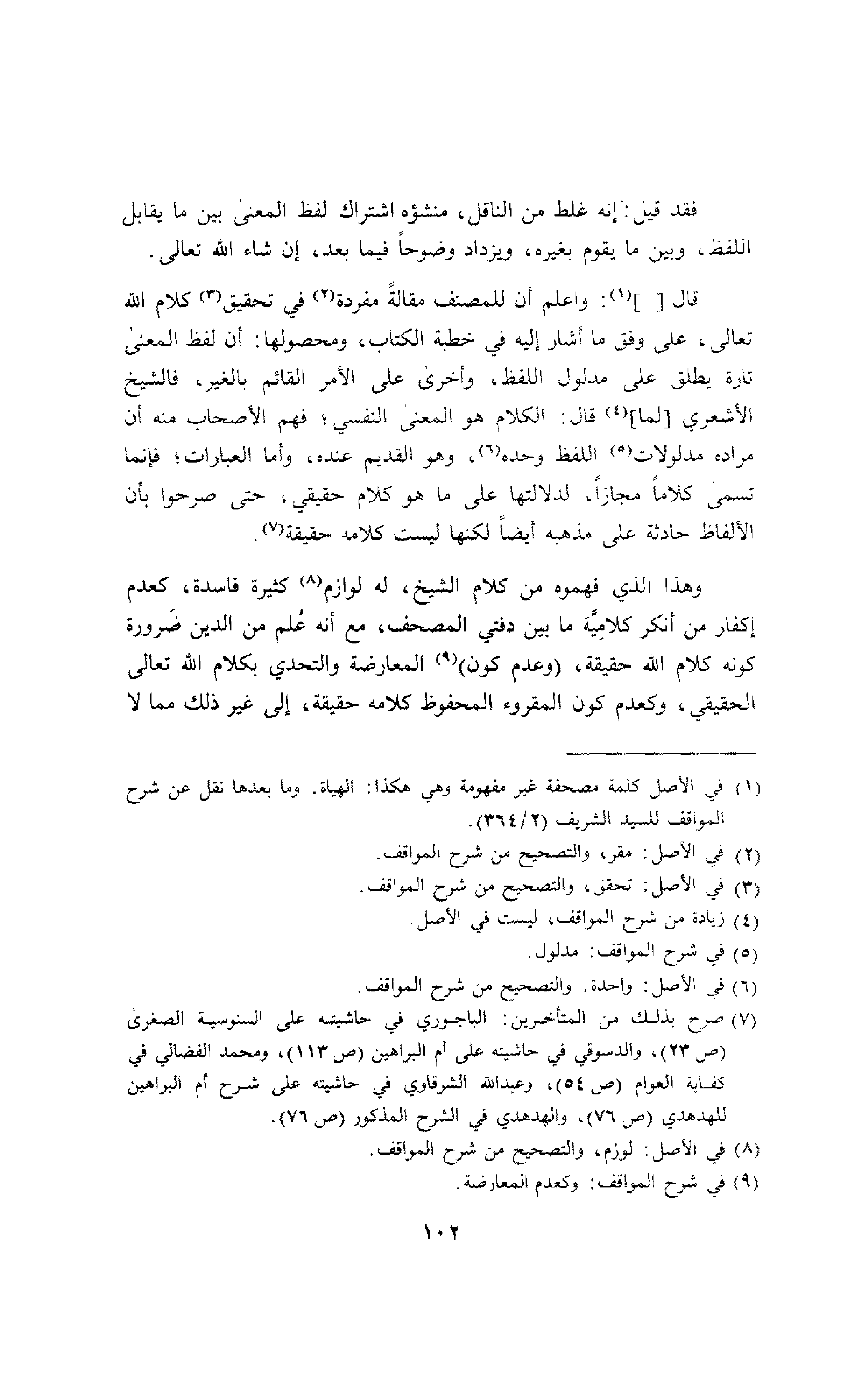 وهذا الذي فهموه من كلام الشيخ، له لوازم8 كثيرة فاسدة، كعدم إكفار من أنكر كلامية ما بين دفتي المصحف، مع أنه عُلِمَ من الدين ضرورة كونه كلام الله حقيقة، "وعدم كون"9 المعارضة والتحدي بكلام الله تعالى الحقيقي، كعدم كون القروء المحفوظ كلامه حقيقة، إلى غير ذلك مما لا