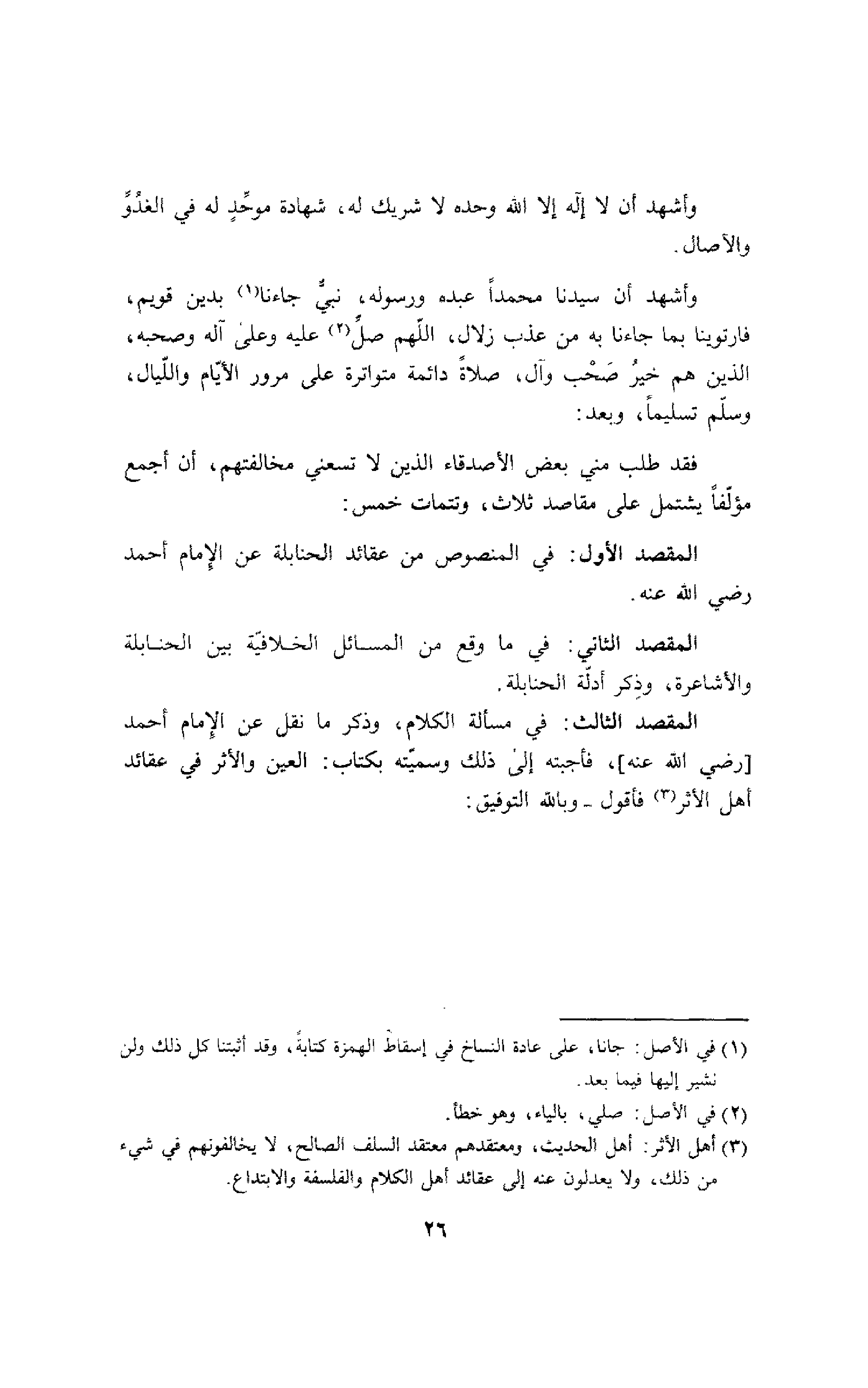 المقصد الثالث: في مسالة الكلام، وذكر ما نقل عن الإمام أحمد "رضي الله عنه"، فاجبته إلى ذلك, وسميته بكتاب: العين والأثر في عقائد أهل الأثر2, فأقول, وبالله التوفيق: