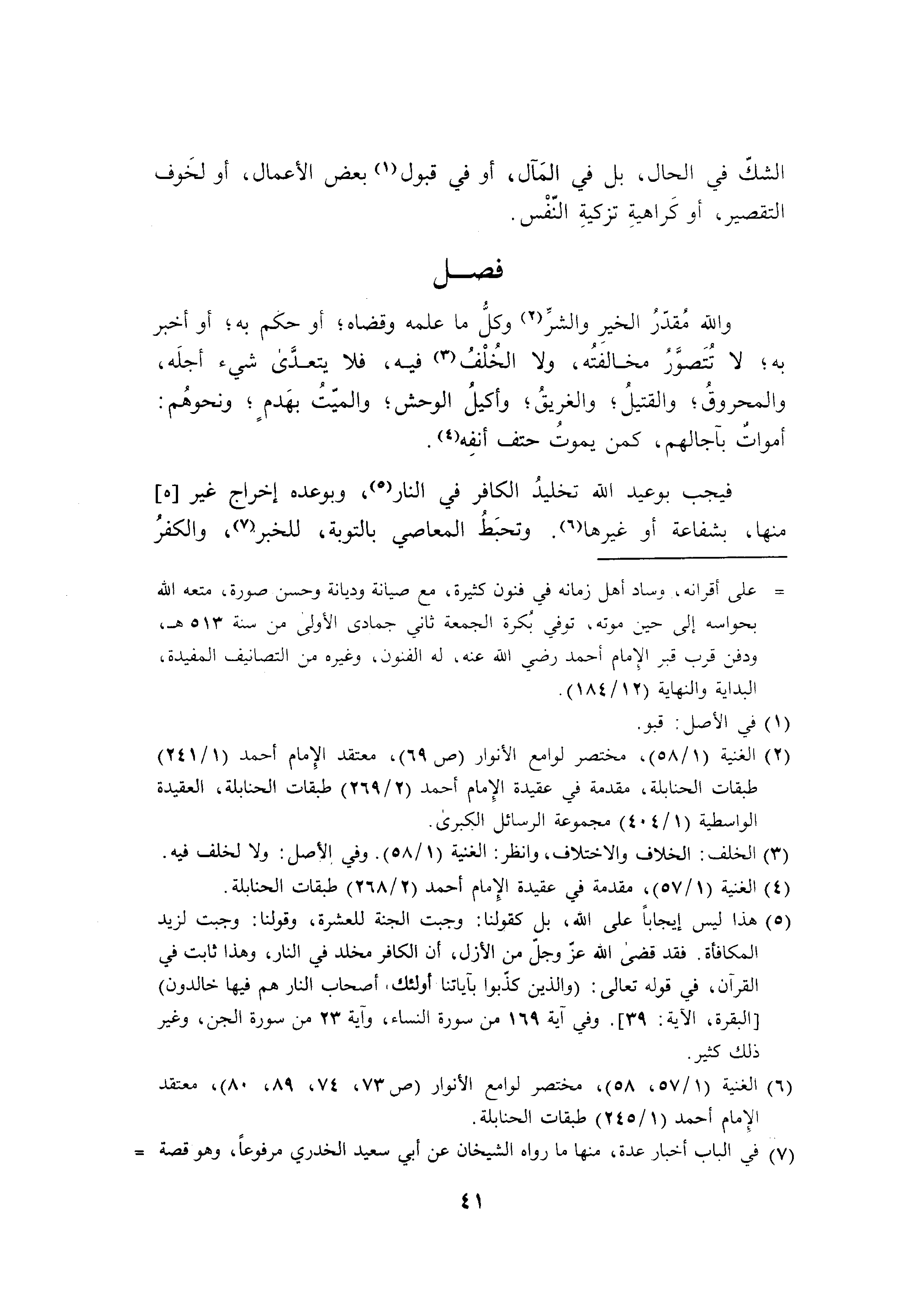 6 الغنية: "57/1، 58"، مختصر لوامع الأنوار: "صـ 73، 74، 80، 89"، معتقد الإمام أحمد: "245/1", طبقات الحنابلة.