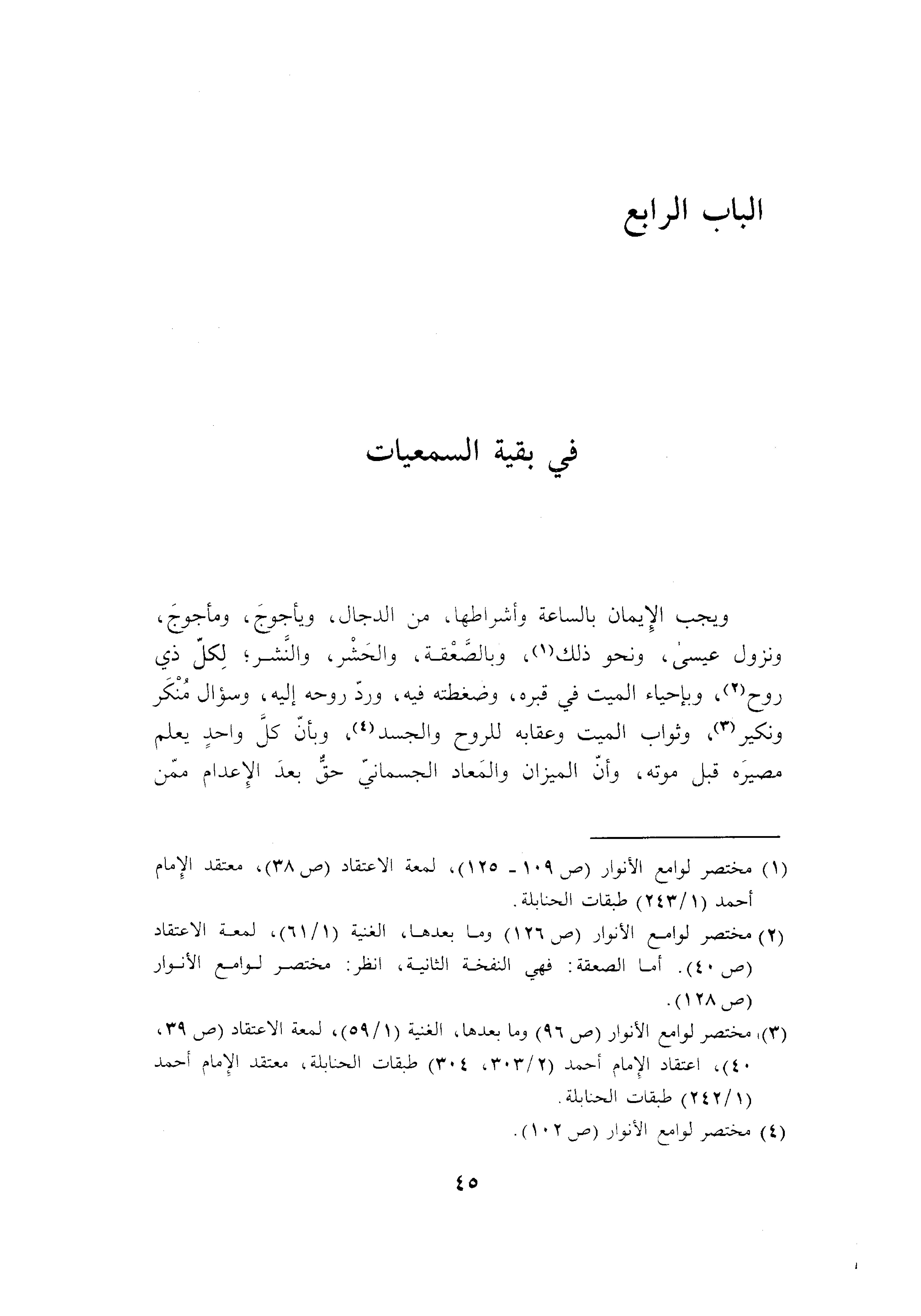 3 مختصر لوامع الأنوار: "صـ 96", وما بعدها، الغنية: "59/1"، لمعة الاعتقاد: "صـ 39، 40"، اعتقاد الإمام أحمد: "303/2، 304", طبقات الحنابلة، معتقد الإمام أحمد: "242/1", طبقات الحنابلة.