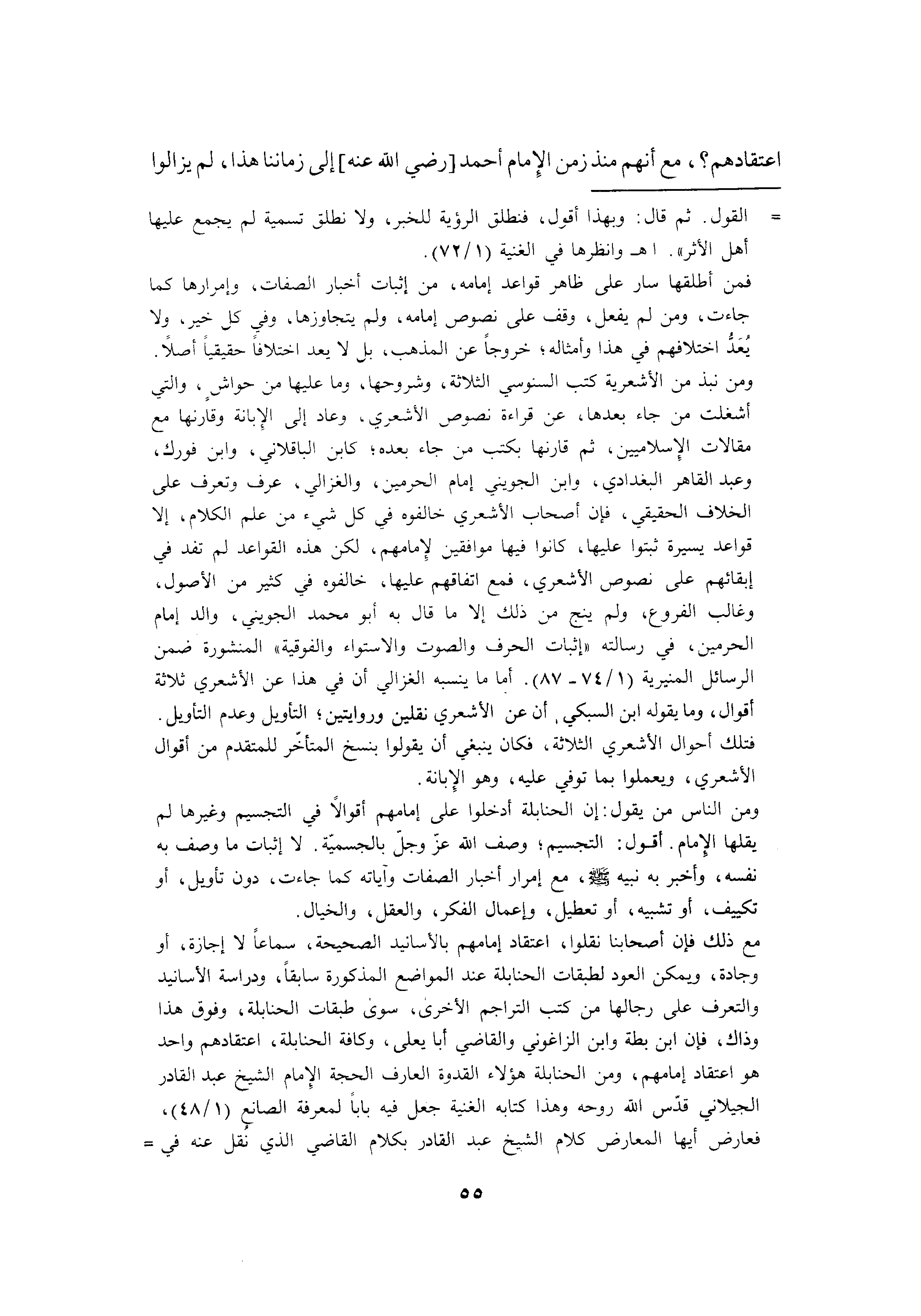 مع ذلك فإن أصحابنا نقلوا اعتقاد إمامهم بالأسانيد الصحيحة، سماعًا لا إجازة، أو وجادة، ويمكن العود لطبقات الحنابلة عند المواضع المذكورة سابقًا، ودراسة الأسانيد والتعرف على رجالها من كتب التراجم الأخرى، سوى طبقات الحنابلة، وفوق هذا وذاك، فإن ابن بطة وابن الزاغواني والقاضي أبا يعلى، وكافة الحنابلة، اعتقادهم واحد هو اعتقاد إمامهم، ومن الحنابلة هؤلاء, القدوة العارف الحجة الإمام الشيخ عبد القادر الجيلاني قدس الله روحه, وهذا كتابه الغنية: جعل فيه بابًا لمعرفة الصانع: "48/1", فعارض أيها المعارض كلام الشيخ عبد القادر بكلام القاضي الذي نقل عنه في =