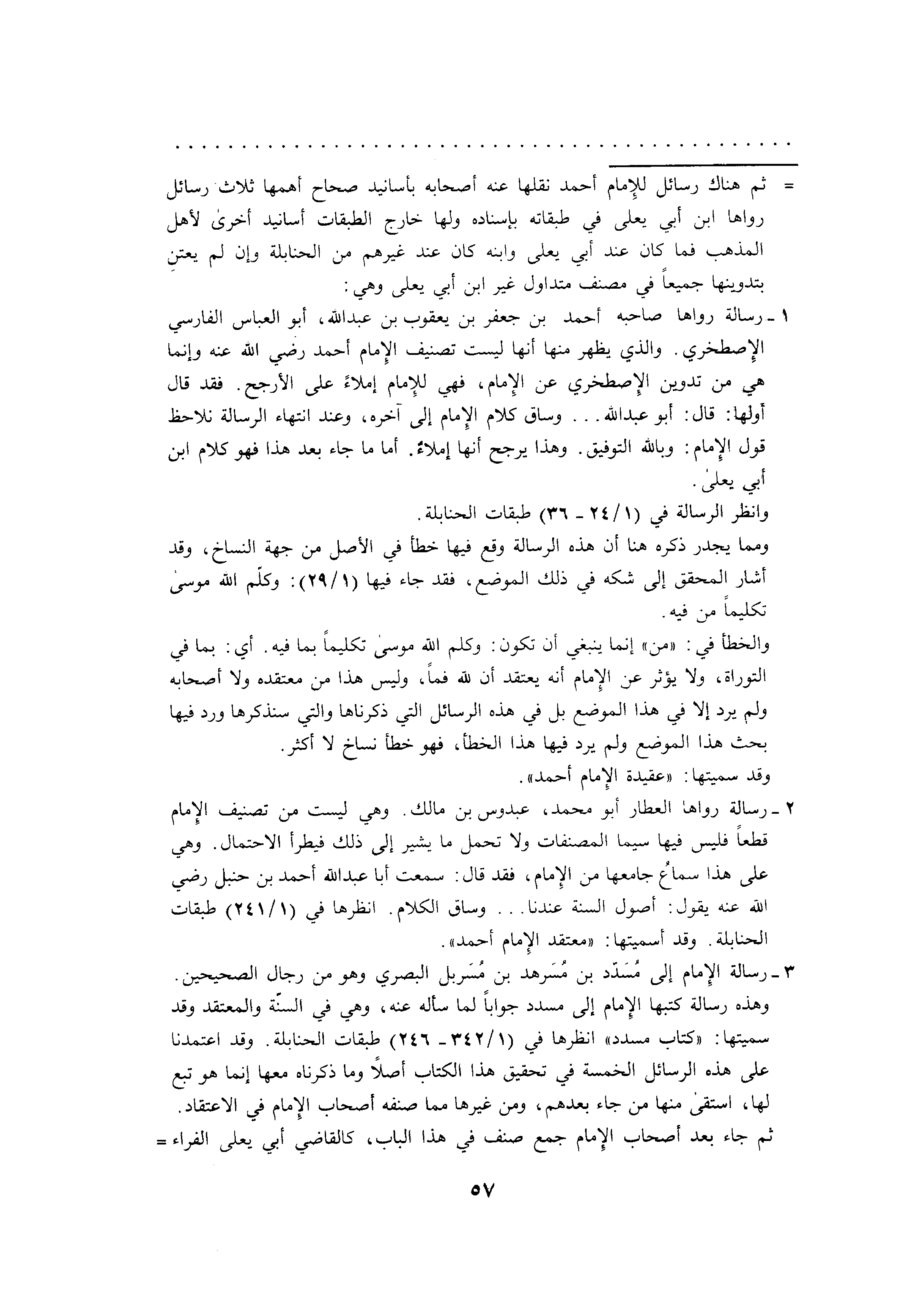 = ثم هناك رسائل للإمام أحمد, نقلها عنه أصحابه بأسانيد صحاح, أهمها ثلاث رسائل رواها ابن أبي يعلى في طبقاته بإسناده, ولها خارج الطبقات أسانيد أخرى لأهل المذهب, فما كان عند أبي يعلى وابنه كان عند غيرهم من الحنابلة, وإن لم يعتنِ بتدوينها جميعًا في مصنف متداول غير ابن أبي يعلى, وهي: