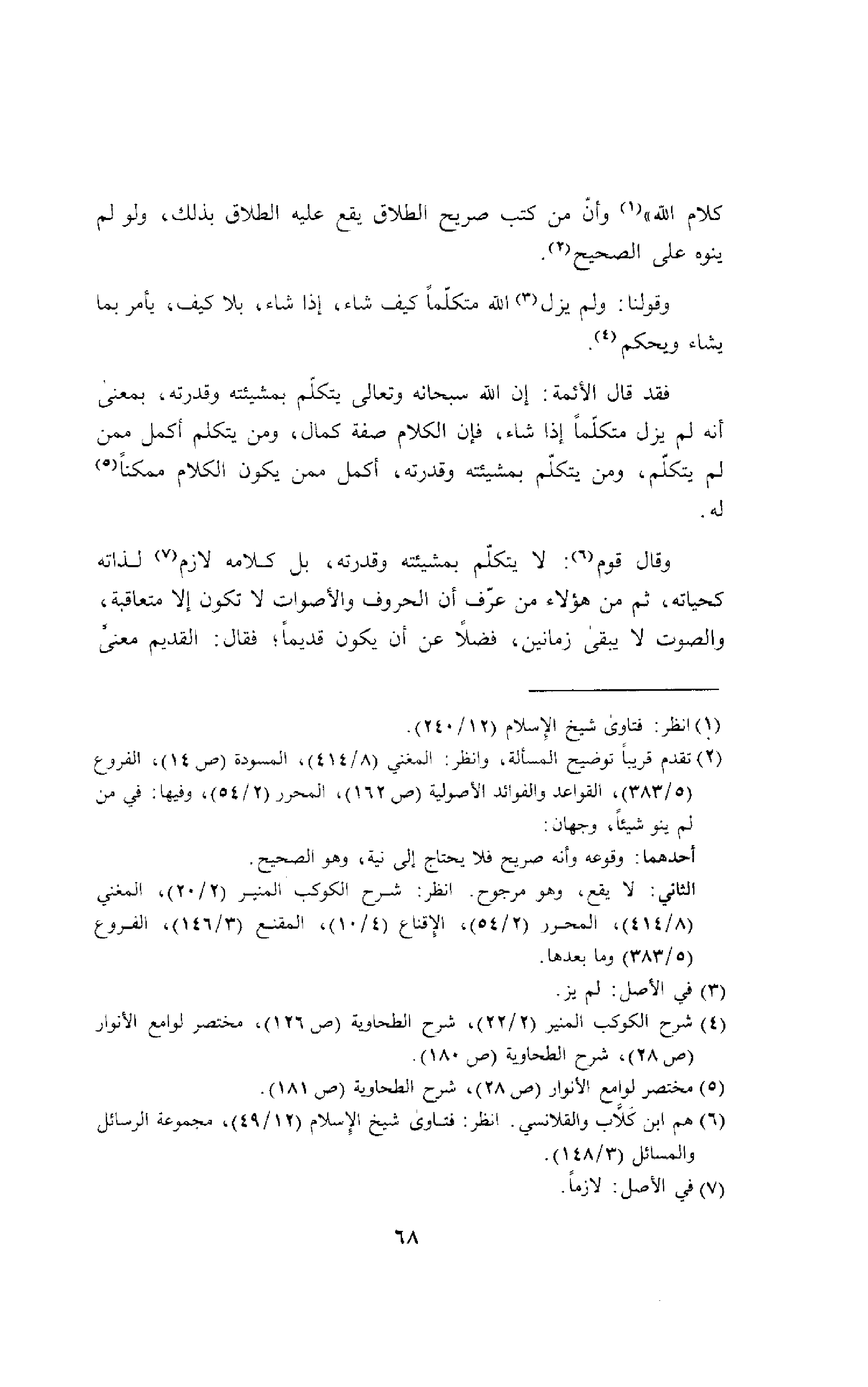 فقد قال الأئمة: إن الله سبحانه وتعالى يتكلم بمشيئته وقدرته، بمعنى أنه لم يزل متكلمًا إذا شاء، فإن الكلام صفة كمال، ومن يتكلم أكمل ممن لم يتكلم، ومن يتكلم بمشيئته وقدرته، أكمل ممن يكون الكلام ممكنًا5 له.
