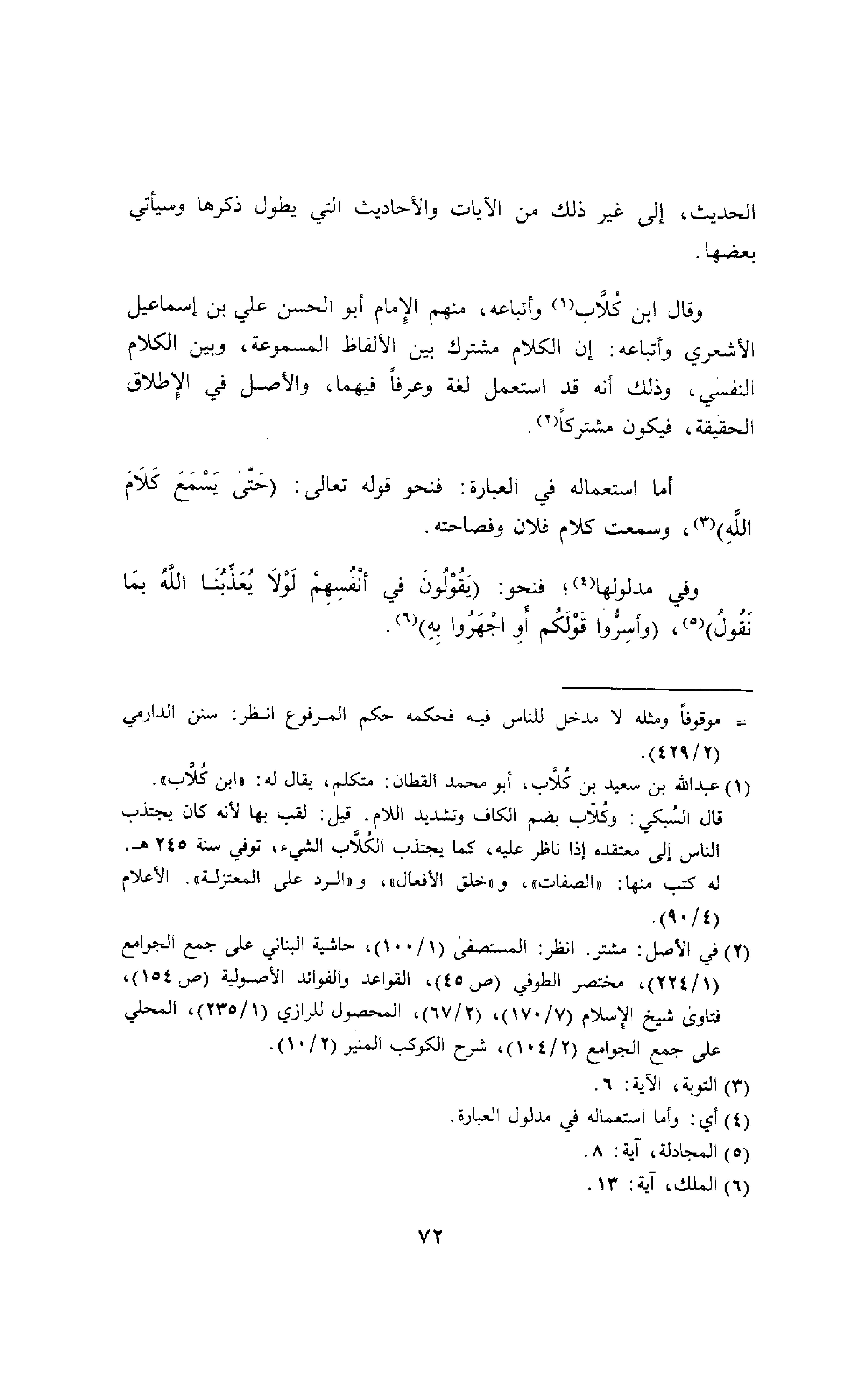1 عبد الله بن سعيد بن كلاب، أبو محمد القطان: متكلم، يقال له: "ابن كلاب", قال السبكي: وكُلَّاب بضم الكاف وتشديد اللام, قيل: لقب بها؛ لأنه كان يجتذب الناس إلى معتقده إذا ناظر عليه، كما يجتذب الكلاب الشيء، توفي سنة 245هـ, له كتب منها: "الصفات"، و"خلق الأفعال"، و"الرد على المعتزلة", الأعلام: "90/4".