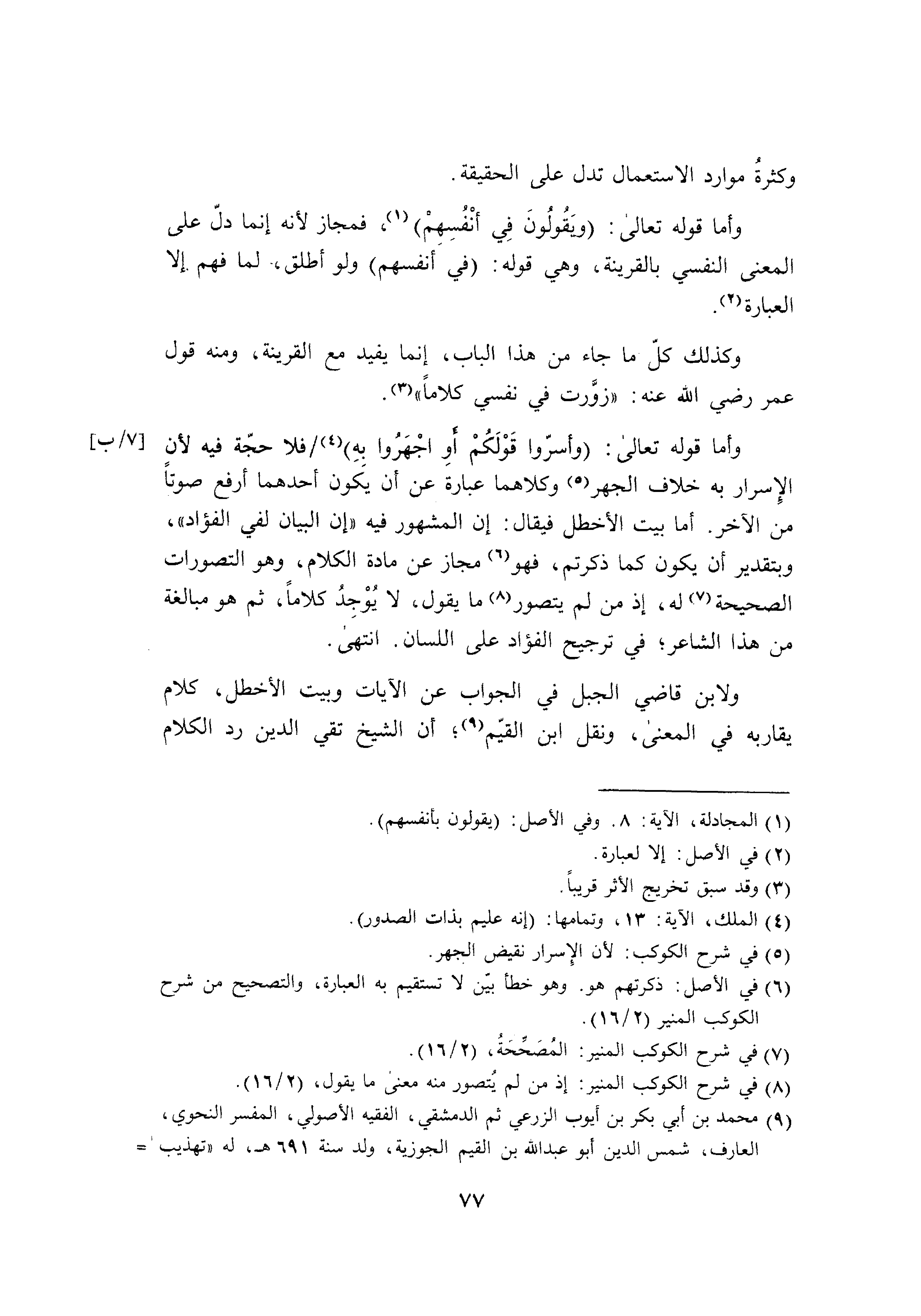 وأما قوله تعالى: {وَأَسِرُّوا قَوْلَكُمْ أَوِ اجْهَرُوا بِهِ} 4, فلا حجة فيه؛ لأن "7/ب" الإسرار به خلاف الجهر5, وكلاهما عبارة عن أن يكون أحدهما أرفع صوتًا من الآخر, أما بيت الأخطل, فيقال: إن المشهور فيه "إن البيان لفي الفؤاد"، وبتقدير أن يكون كما ذكرتم، فهو6 مجاز عن مادة الكلام، وهو التصورات الصحيحة7 له، إذ من لم يتصور8 ما يقول، لا يُوجِدُ كلامًا، ثم هو مبالغة من هذا الشاعر, في ترجيح الفؤاد على اللسان, انتهى.