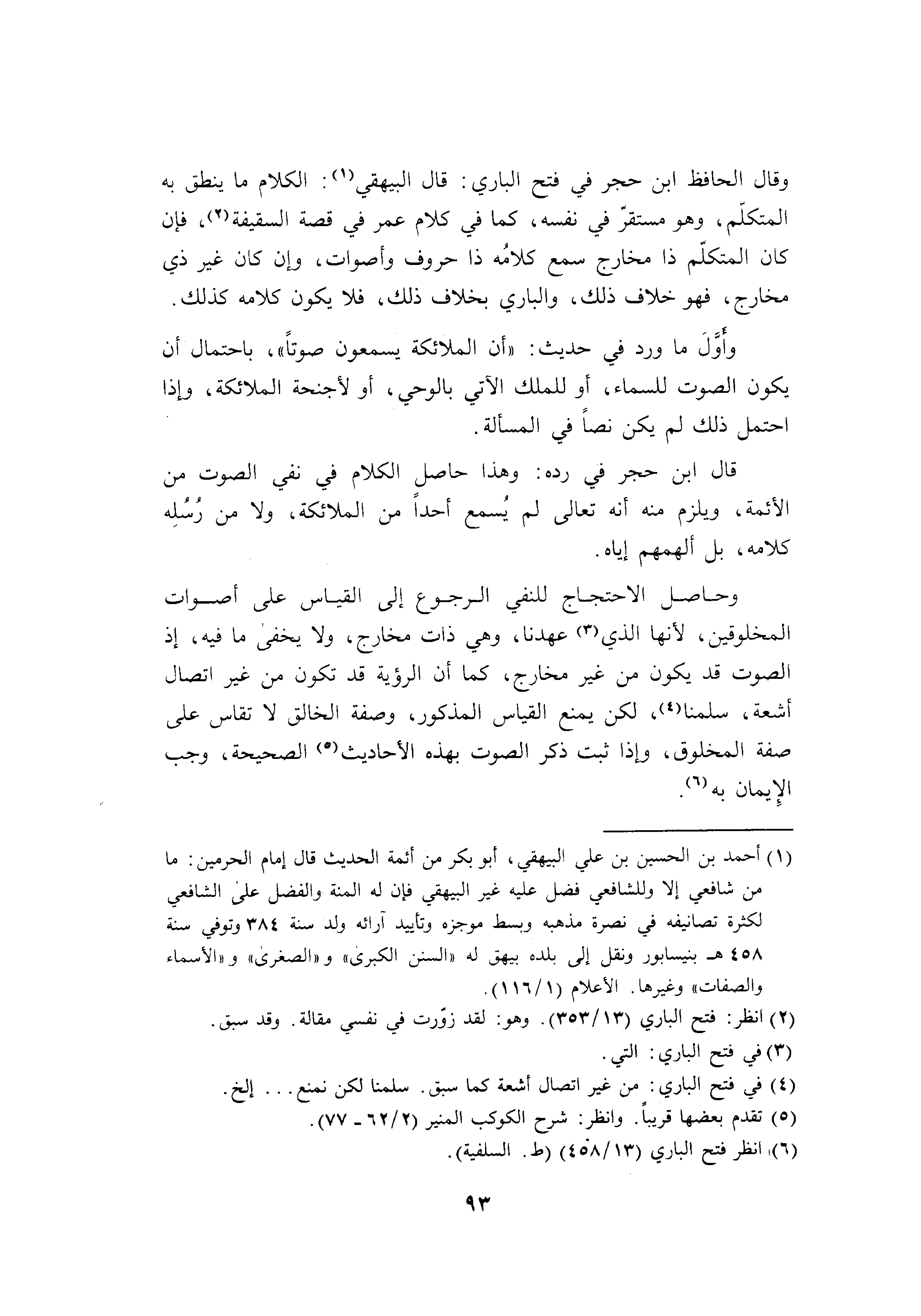 رد الحافظ ابن حجر على قول البيهقي في كلام الله عز وجل