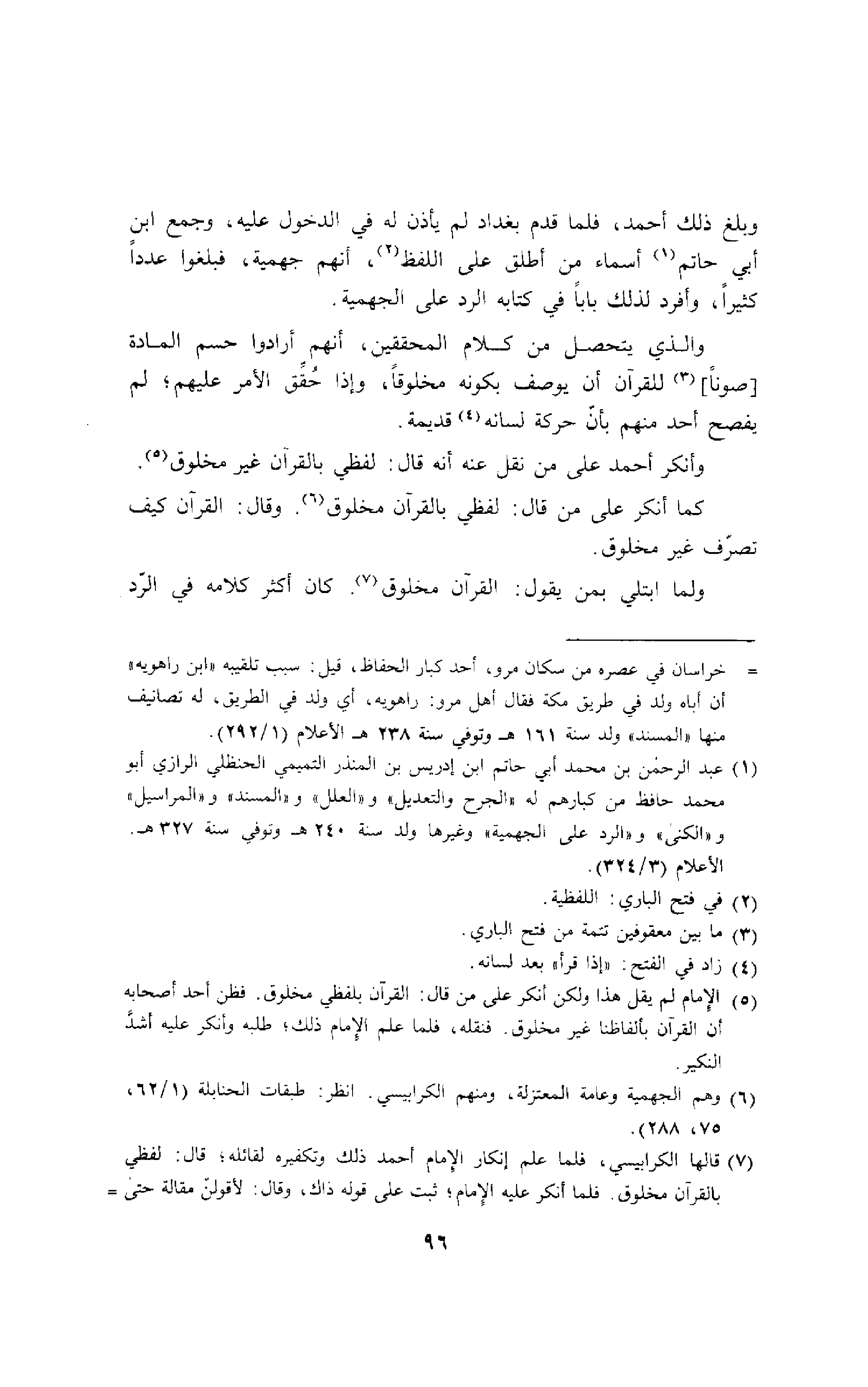 وبلغ ذلك أحمد، فلما قدم بغداد لم يأذن له في الدخول عليه، وجمع ابن أبي حاتم1 أسماء من أطلق على اللفظ2، أنهم جهمية، فبلغوا عددًا كثيرًا، وأفرد لذلك بابًا في كتابه: الرد على الجهمية.
