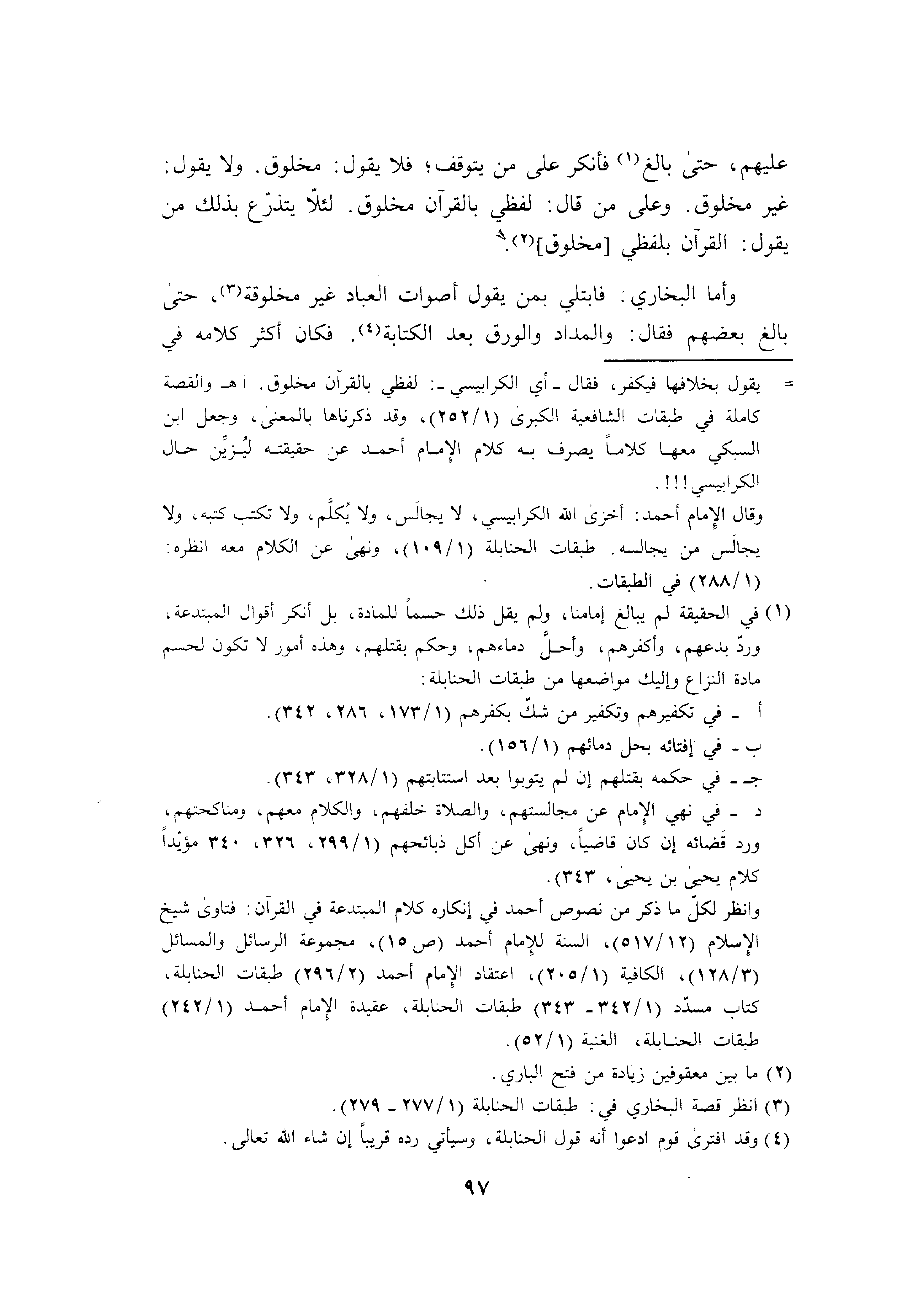 = يقول بخلافها, فيكفر", فقال -أي الكرابيسي-: لفظي بالقرآن مخلوق, ا. هـ, والقصة كاملة في طبقات الشافعية الكبرى: "252/1"، وقد ذكرناها بالمعنى، وجعل ابن السبكي معها كلامًا يصرف به كلام الإمام أحمد عن حقيقته؛ ليزين حال الكرابيسي.