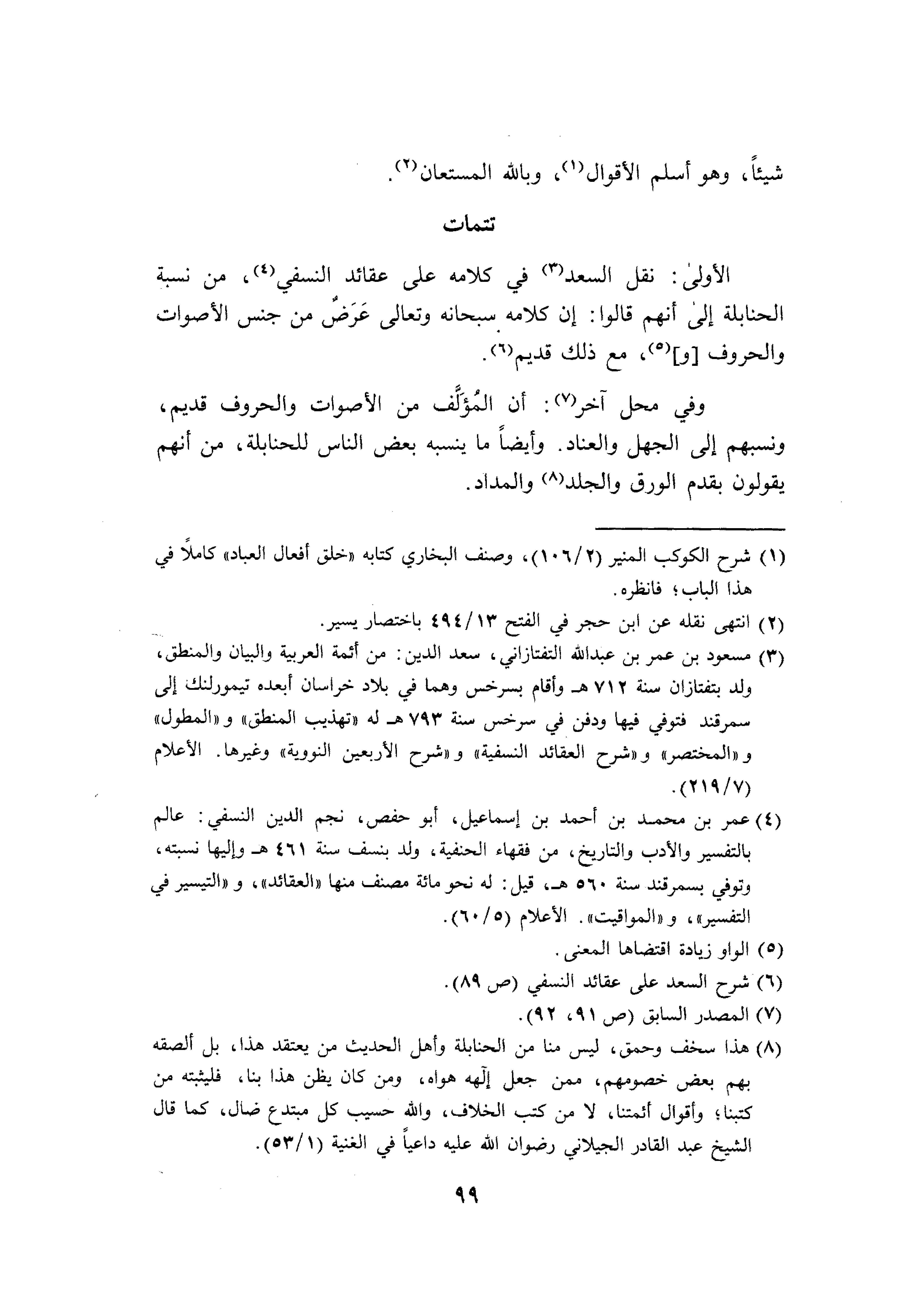 نقل السعد3 في كلامه على عقائد النسفي4، من نسبة الحنابلة إلى أنهم قالوا: إن كلامه سبحانه وتعالى عرض من جنس الأصوات والحروف [و] 5, مع ذلك قديم6.