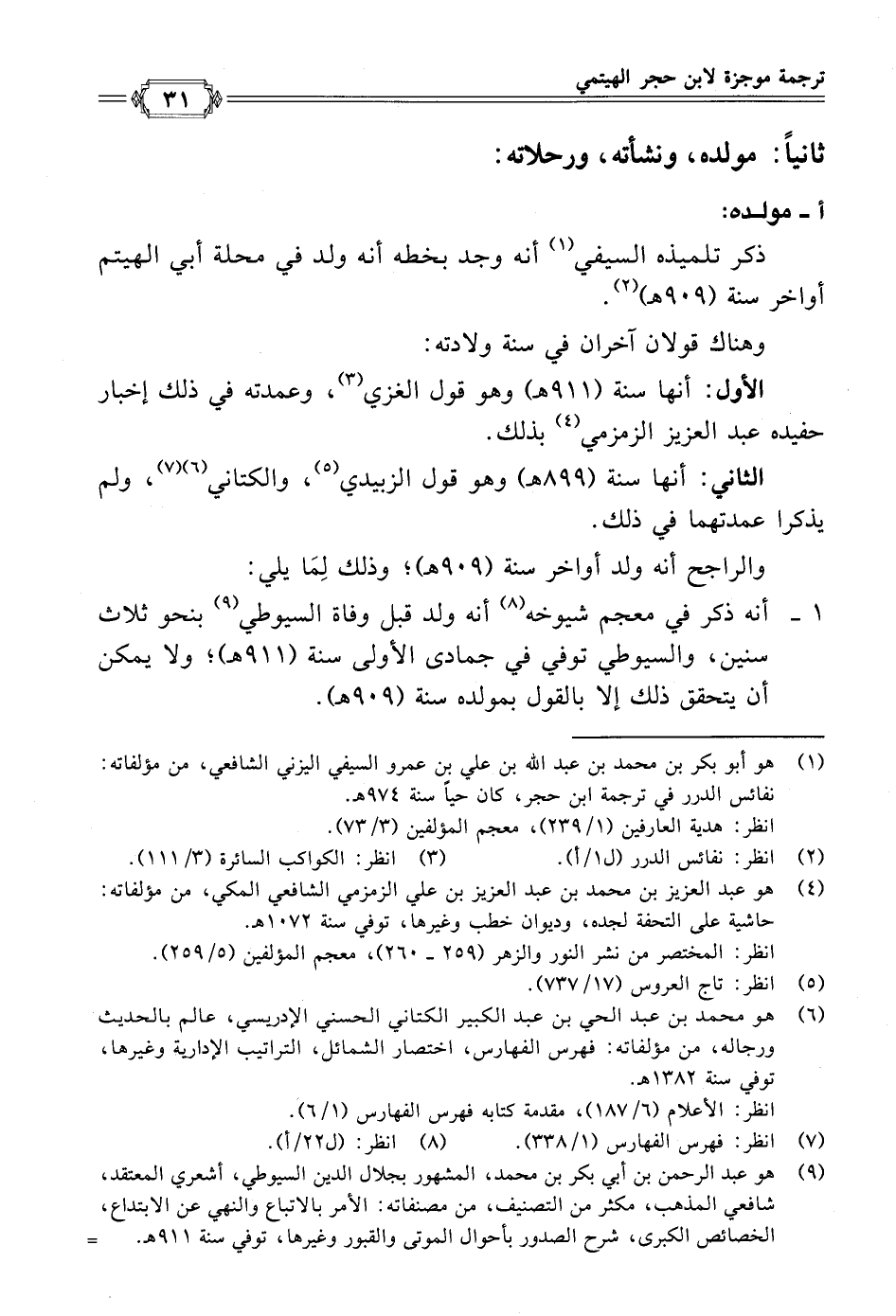١ - أنه ذكر في معجم شيوخه (¬٨) أنه ولد قبل وفاة السيوطي (¬٩) بنحو ثلاث سنين، والسيوطي توفي في جمادى الأولى سنة (٩١١ هـ)؛ ولا يمكن أن يتحقق ذلك إلا بالقول بمولده سنة (٩٠٩ هـ).