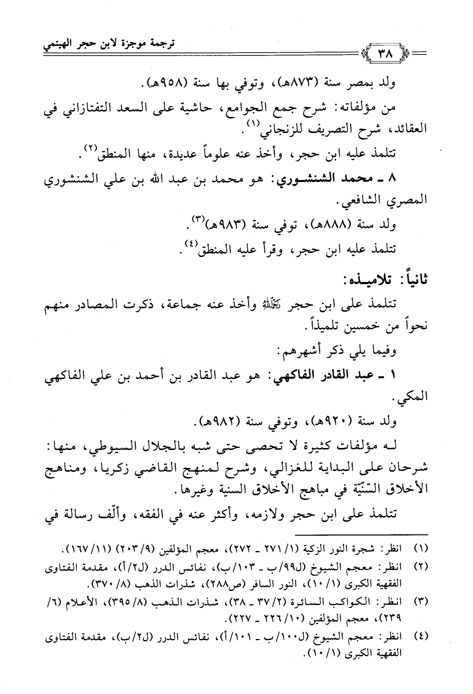 (¬٤) انظر: معجم الشيوخ (ل ١٠٠/ ب- ١٠١/ أ)، نفائس الدرر (ل ٢/ ب)، مقدمة الفتاوى الفقهية الكبرى (١/ ١٠).