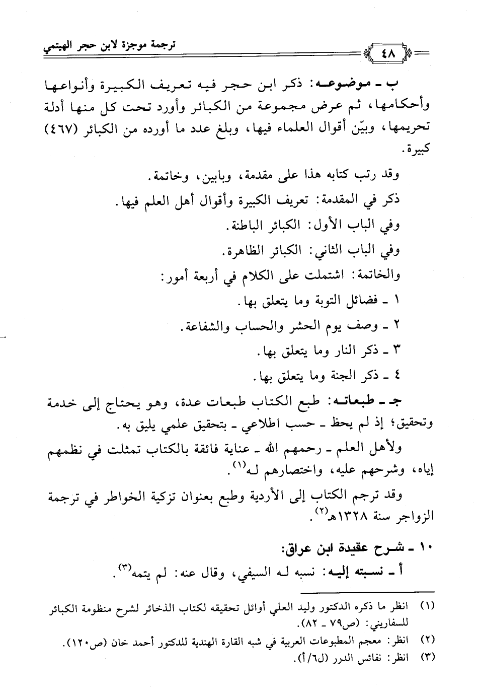 (¬١) انظر ما ذكره الدكتور وليد العلي أوائل تحقيقه لكتاب الذخائر لشرح منظومة الكبائر للسفاريني: (ص ٧٩ - ٨٢).