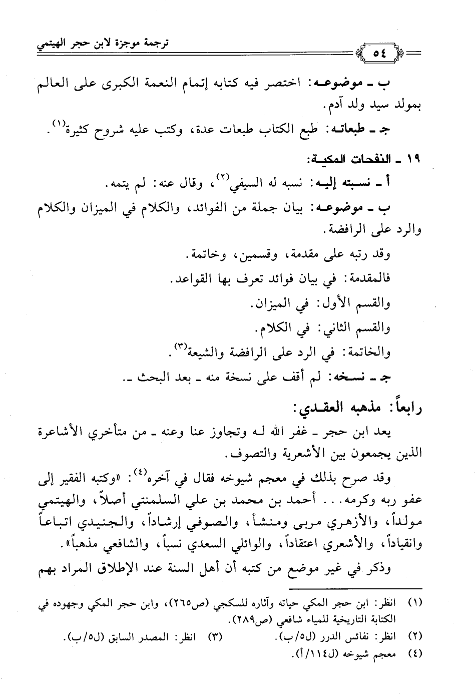 (¬١) انظر: ابن حجر المكي حياته وآثاره للسكجي (ص ٢٦٥)، وابن حجر المكي وجهوده في الكتابة التاريخية للمياء شافعي (ص ٢٨٩).