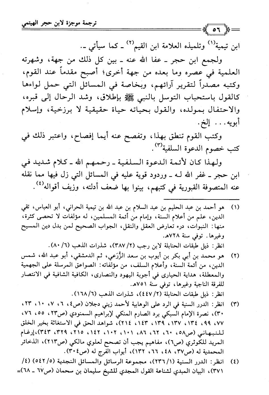 ولهذا كان لأئمة الدعوة السلفية - رحمهم الله - كلام شديد في - ابن حجر - غفر الله له - وردود قوية عليه في المسائل التي زل فيها مما نقله عنه المتصوفة القبورية في كتبهم، بينوا بها ضعف أدلته، وزيف أقواله (¬٤).