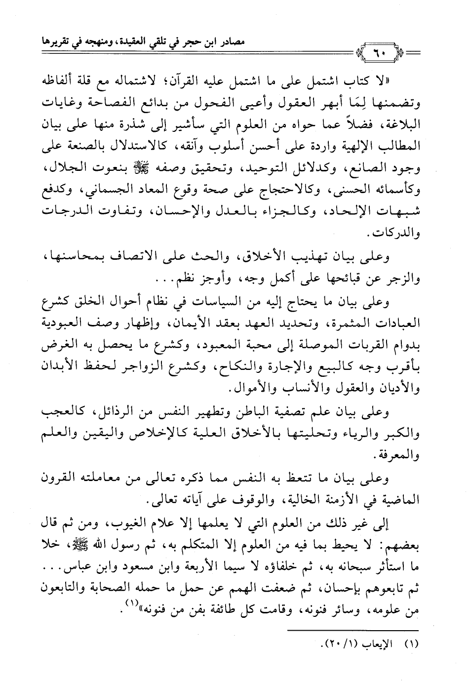 "لا كتاب اشتمل على ما اشتمل عليه القرآن؛ لاشتماله مع قلة ألفاظه وتضمنها لِمَا أبهر العقول وأعيى الفحول من بدائع الفصاحة وغايات البلاغة، فضلًا عما حواه من العلوم التي سأشير إلى شذرة منها على بيان المطالب الإلهية واردة على أحسن أسلوب وآنقه، كالاستدلال بالصنعة على وجود الصانع، وكدلائل التوحيد، وتحقيق وصفه - سُبْحَانَهُ وَتَعَالَى - بنعوت الجلال، وكأسمائه الحسنى، وكالاحتجاج على صحة وقوع المعاد الجسماني، وكدفع شبهات الإلحاد، وكالجزاء بالعدل والإحسان، وتفاوت الدرجات والدركات.