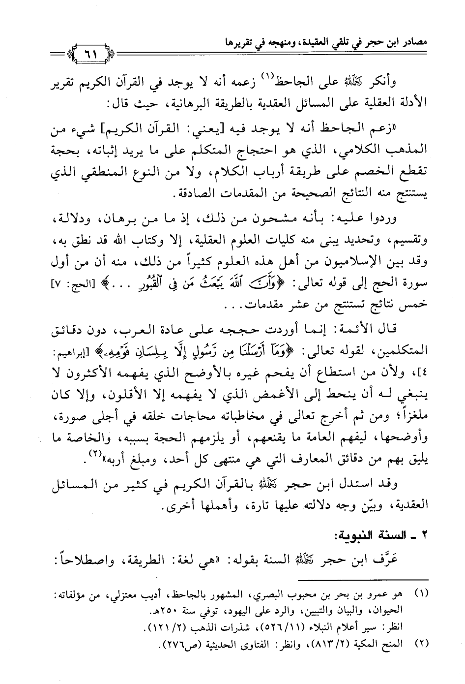 وأنكر - رَحِمَهُ اللَّه - على الجاحظ (¬١) زعمه أنه لا يوجد في القرآن الكريم تقرير الأدلة العقلية على المسائل العقدية بالطريقة البرهانية، حيث قال: