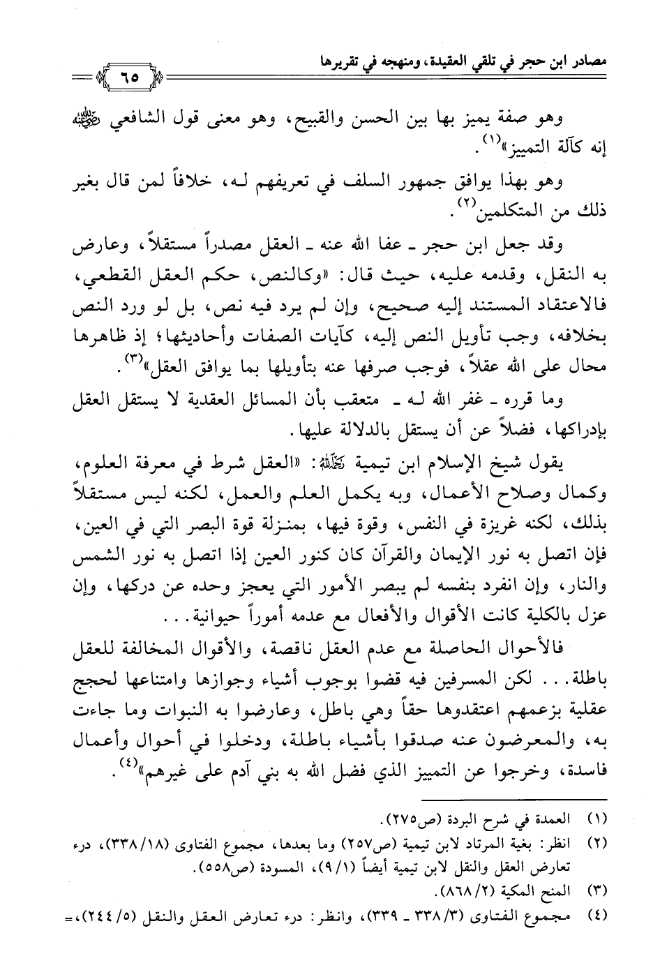 وقد جعل - ابن حجر - عفا الله عنه - العقل مصدرًا مستقلًا، وعارض به النقل، وقدمه عليه، حيث قال: "وكالنص، حكم العقل القطعي، فالاعتقاد المستند إليه صحيح، وإن لم يرد فيه نص، بل لو ورد النص بخلافه، وجب تأويل النص إليه، كآيات الصفات وأحاديثها؛ إذ ظاهرها محال على الله عقلًا، فوجب صرفها عنه بتأويلها بما يوافق العقل" (¬٣).