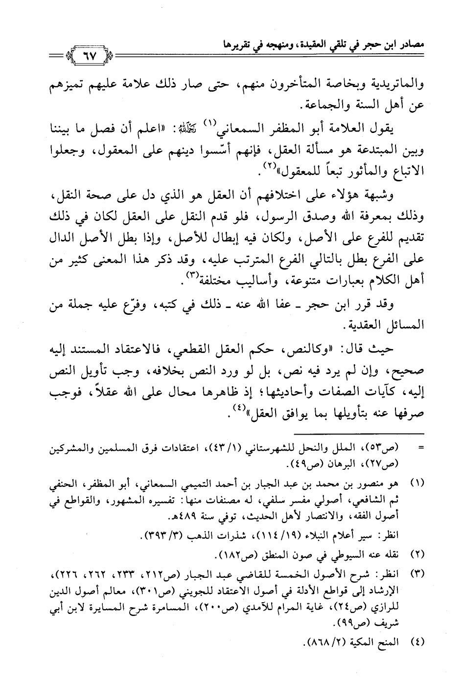 (¬١) هو منصور بن محمد بن عبد الجبار بن أحمد التميمي السمعاني، أبو المظفر، الحنفي ثم الشافعي، أصولي مفسر سلفي، له مصنفات منها: تفسيره المشهور، والقواطع في أصول الفقه، والانتصار لأهل الحديث، توفي سنة ٤٨٩ هـ.