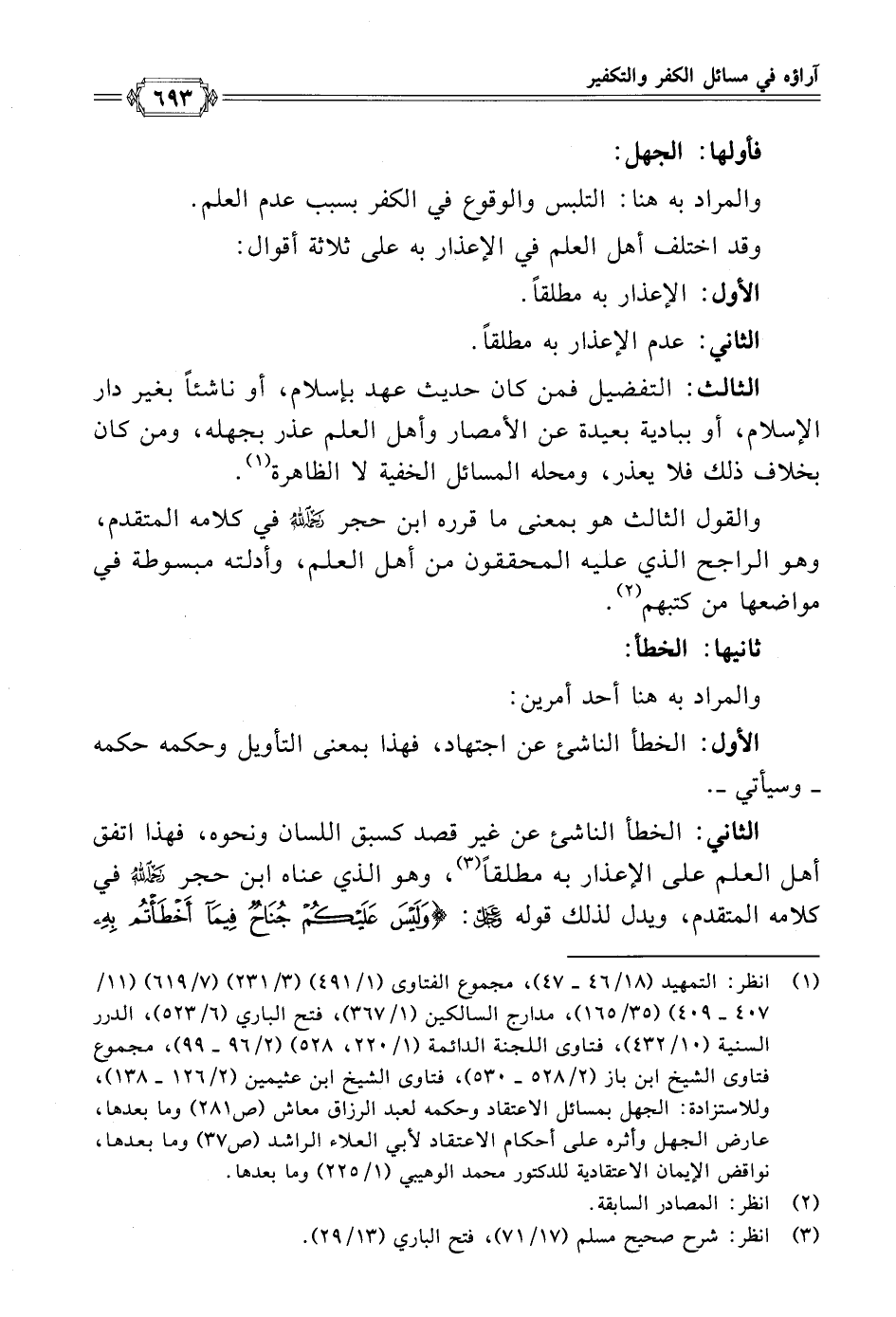 (¬١) انظر: التمهيد (١٨/ ٤٦ - ٤٧)، مجموع الفتاوى (١/ ٤٩١) (٣/ ٢٣١) (٧/ ٦١٩) (١١/ ٤٠٧ - ٤٠٩) (٣٥/ ١٦٥)، مدارج السالكين (١/ ٣٦٧)، فتح الباري (٦/ ٥٢٣)، الدرر السنية (١٠/ ٤٣٢)، فتاوى اللجنة الدائمة (١/ ٢٢٠، ٥٢٨) (٢/ ٩٦ - ٩٩)، مجموع فتاوى الشيخ ابن باز (٢/ ٥٢٨ - ٥٣٠)، فتاوى الشيخ ابن عثيمين (٢/ ١٢٦ - ١٣٨)، وللاستزادة: الجهل بمسائل الاعتقاد وحكمه لعبد الرزاق معاش (ص ٢٨١) وما بعدها، عارض الجهل وأثره على أحكام الاعتقاد لأبي العلاء الراشد (ص ٣٧) وما بعدها، نواقض الإيمان الاعتقادية للدكتور محمد الوهيبي (١/ ٢٢٥) وما بعدها.