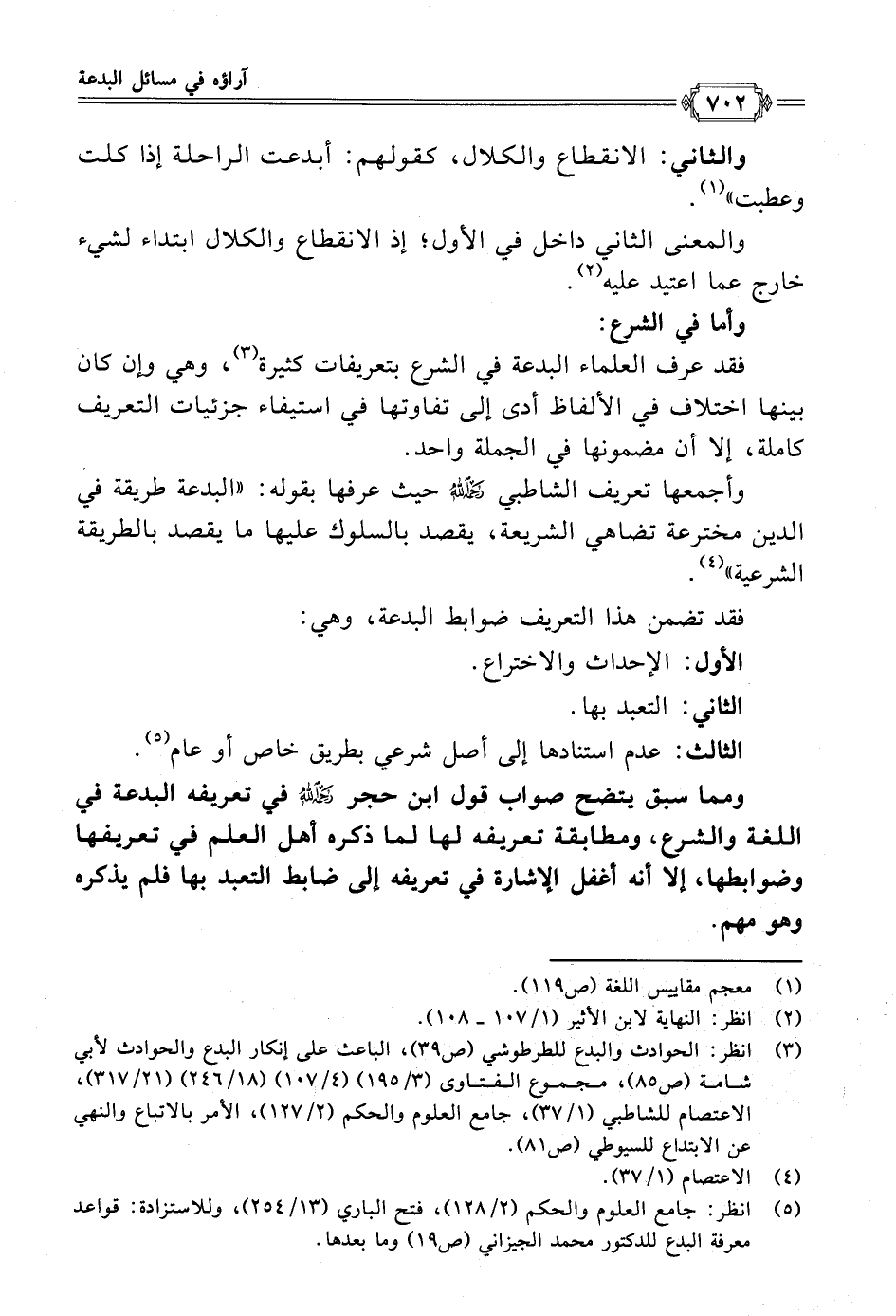 (¬٥) انظر: جامع العلوم والحكم (٢/ ١٢٨)، فتح الباري (١٣/ ٢٥٤)، وللاستزادة: قواعد معرفة البدع للدكتور محمد الجيزاني (ص ١٩) وما بعدها.