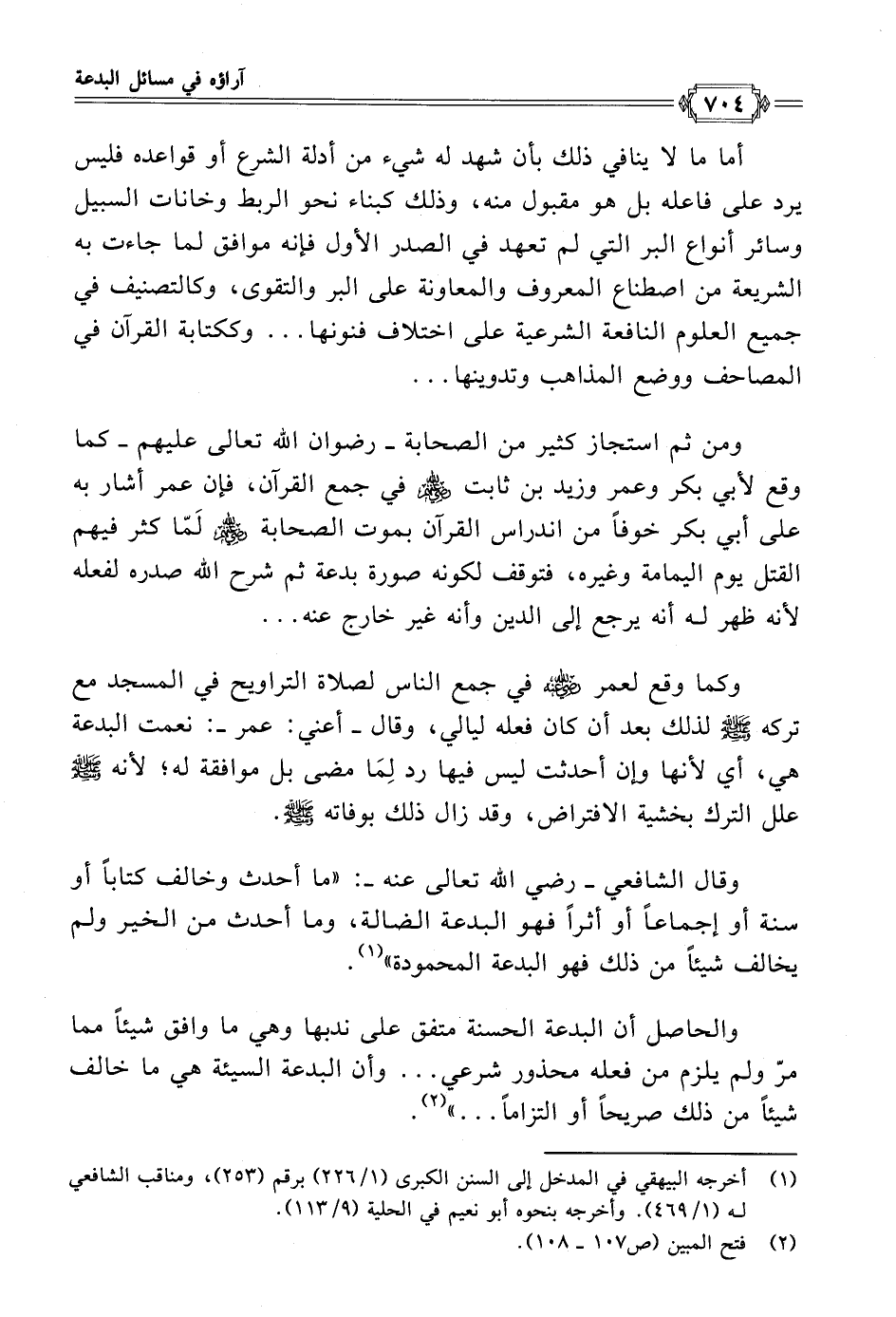 ومن ثم استجاز كثير من الصحابة - رضوان الله تعالى عليهم - كما وقع لأبي بكر وعمر وزيد بن ثابت - رضي الله عنهم - في جمع القرآن، فإن عمر أشار به على أبي بكر خوفًا من اندراس القرآن بموت الصحابة - رضي الله عنهم - لَمّا كثر فيهم القتل يوم اليمامة وغيره، فتوقف لكونه صورة بدعة ثم شرح الله صدره لفعله لأنه ظهر له أنه يرجع إلى الدين وأنه غير خارج عنه ...
