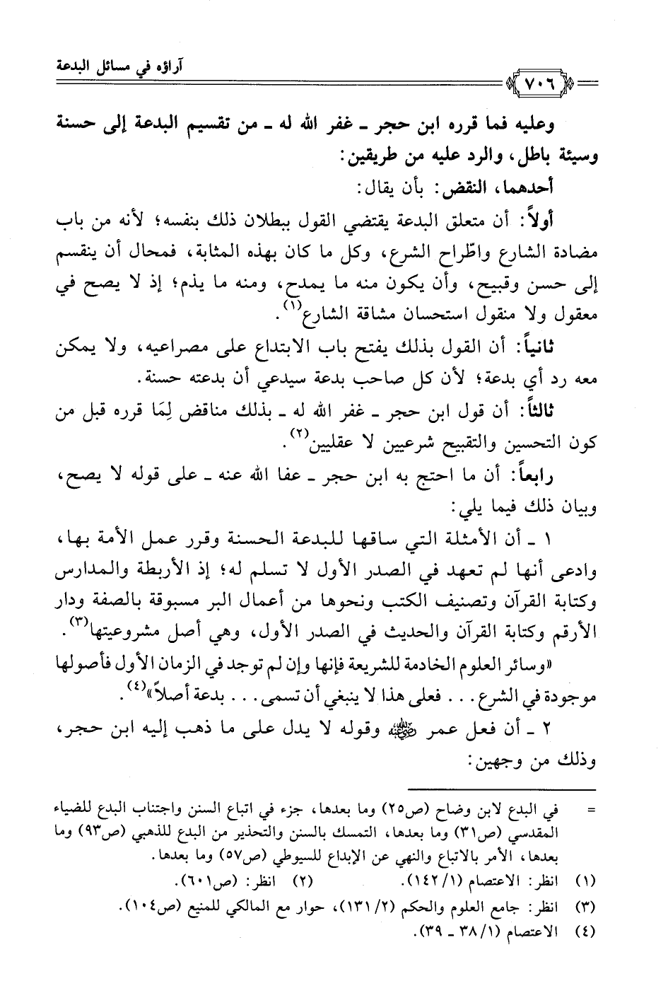 وعليه فما قرره ابن حجر - غفر الله له - من تقسيم البدعة إلى حسنة وسيئة باطل، والرد عليه من طريقين: