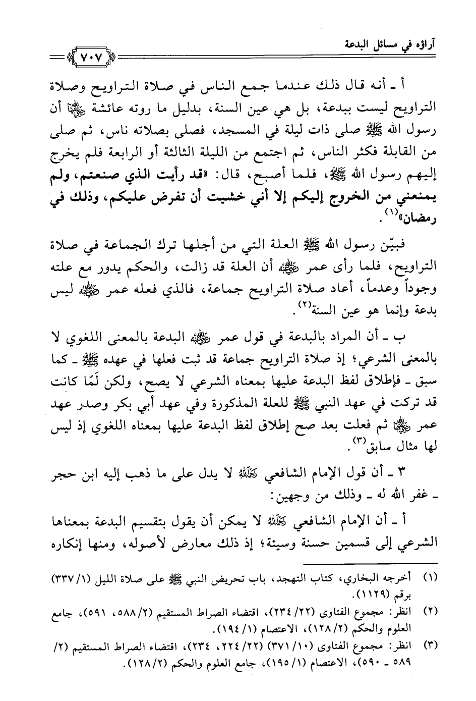 ب - أن المراد بالبدعة في قول عمر - رضي الله عنه - البدعة بالمعنى اللغوي لا بالمعنى الشرعي؛ إذ صلاة التراويح جماعة قد ثبت فعلها في عهده - صلى الله عليه وسلم - كما سبق - فإطلاق لفظ البدعة عليها بمعناه الشرعي لا يصح، ولكن لَمّا كانت قد تركت في عهد النبي - صلى الله عليه وسلم - للعلة المذكورة وفي عهد أبي بكر وصدر عهد عمر - رضي الله عنهما - ثم فعلت بعد صح إطلاق لفظ البدعة عليها بمعناه اللغوي إذ ليس لها مثال سابق (¬٣).