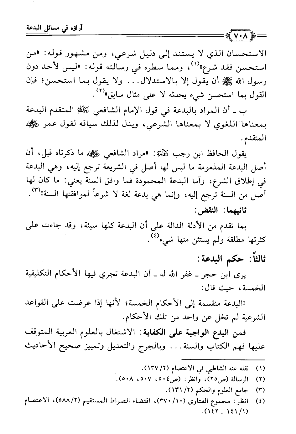 فمن البدع الواجبة على الكفاية: الاشتغال بالعلوم العربية المتوقف عليها فهم الكتاب والسنة ... وبالجرح والتعديل وتمييز صحيح الأحاديث
